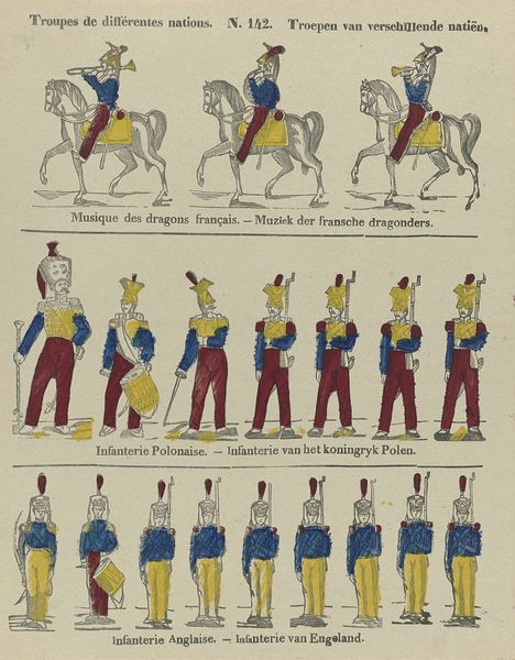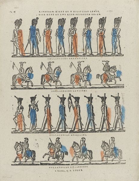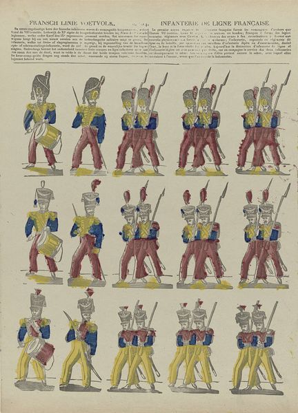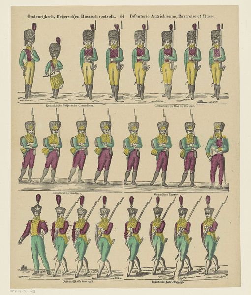 Curator: This print, titled "Grenadiers van de garde / Grenadiers de la garde / Voltigeurs," by Philippus Jacobus Brepols, likely created between 1800 and 1833, depicts rows of soldiers, and I find its flat composition quite striking. The varied colour schemes are fascinating, but I am unsure as to what they might signify. What jumps out at you about this work? Editor: Well, it's hard not to notice the lithographic and etched lines; the method by which it's reproduced seems just as vital to its effect as the men being portrayed. What can you tell me about that material process and its role? Curator: The etching and lithographic printmaking process is precisely where we find cultural clues. The creation of multiple editions, due to those printing techniques, speaks to broader access and consumption. Notice the precision and detail achieved through these processes; it enabled a wider audience to consume imagery related to military prowess and national identity. This aligns with the rise of nationalism in Europe at the time. Editor: That's a great point. The printmaking makes the imagery available to many and spreads a particular nationalistic message. Were these prints intended to celebrate the individuals represented or to inspire specific political actions? Curator: Excellent question. Looking through a materialist lens, one might suggest it is not the celebration of individual heroism that matters most here. Instead, it emphasizes the manufacturing of consent, the mass production of patriotic imagery as a tool of social and political control. The work encourages us to examine the labor behind the image, and whose interests that labour serves. Editor: I never considered prints in this way, it changes everything! Curator: It certainly expands the view. Looking beyond aesthetics encourages engagement with social structures and modes of production. Editor: Thank you, that helps me consider the art from a much broader social context. Curator: My pleasure; art invites us to explore and challenge these very assumptions!