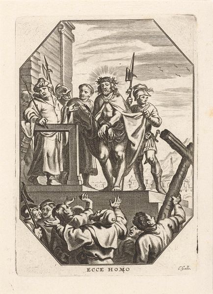 Editor: This engraving from 1665 by G. Wingendorp, titled "Roman Ruler and Justice on a Chariot", caught my eye because of the sheer density of figures and symbols! There is almost a tension between classical ideals and Baroque abundance. What do you see in this piece? Curator: The image presents a complex allegorical scene embedded within specific social and institutional frameworks. The figure of Justitia, blindfolded and holding scales, is a prominent symbol of justice, of course. What is really interesting here is the context in which this symbol is presented and who would buy and promote the dissemination of the image. Editor: You mean, besides the artist himself? Curator: Exactly. The print served a broader function beyond pure aesthetics. It was produced in Leiden for a publication by Hackius and represents a statement of power and authority connected to Roman ideals in the context of Dutch printmaking and readership during the Dutch Golden Age. The central Roman ruler becomes a symbol deployed in the early days of the free press to imply an adherence to Roman rule and to the idea of law and order amid increased output, which was sometimes seen as bordering on the unruliness of ideas! What is being promoted alongside the images? What words are next to it, printed and distributed with it? Editor: Oh, that makes so much sense! I see now the text in Latin up top. So, the image really participates in promoting or legitimizing the printing house of Hackius? Curator: Precisely! And by association, legitimizes the act of publication at that moment in time. It’s a calculated move to link their work with the gravitas of Roman history and the enduring ideal of justice, not only the content itself, but a sort of truthfulness about the vehicle containing this content.. Editor: So, it's more than just an image; it’s a commentary on the very act of producing and consuming information. Fascinating. Curator: Exactly. By understanding the print within the socio-political landscape of the time, we get a clearer picture of its intended audience, message, and purpose. Editor: Thanks for that insight! I will now look at historical artwork like this through this political and societal lens.