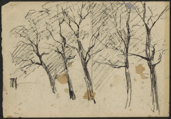 Curator: At first glance, the pencil drawing by Anton Mauve simply feels… wintry. There’s a bleakness to the bare trees. Editor: Well, “Pad langs een bomengroep,” or “Path by a Group of Trees” was created sometime between 1848 and 1888, and offers a look at Mauve’s technical process, hinting at his broader artistic concerns regarding representations of rural life. It makes me consider representations of access, particularly who is allowed entry to traverse certain rural spaces, then and now. Curator: Yes, and note how he renders the trees – these dark vertical marks almost cage the composition. They create a stark barrier on the horizon line, no? Yet the very human and persistent road cuts through, like an imposed will, perhaps a claim on land or an indication of its evolving purpose and labor division. Editor: You are drawn to that visual tension, I can see, which does invite further considerations of cultural history, specifically. Looking more closely at the symbol of the road itself… it represents something very primal to humans. From early trade routes to modern highways, pathways connect us not just geographically, but also through shared commerce and experience. Curator: True. And Mauve captures this simplicity so adeptly, doesn’t he? Using only pencil, he evokes a sense of depth. The tonal variation across the pathway guides the eye, urging consideration of where it could lead… Who walks this path and toward which place and purpose? Editor: The trees almost resemble gothic spires. A pencil, though humble, proves here the vessel of potent symbolic freight. I do believe Mauve captured something essential about the enduring human-nature connection in transient times. Curator: He did. What at first appears a simple study of a stand of trees then slowly opens up, revealing deeper histories and reflections on access and the marks humans imprint upon nature. Editor: Agreed. The pathway carries more than meets the eye, and these stark visuals invite a multitude of considerations about who is impacted by its existence.
