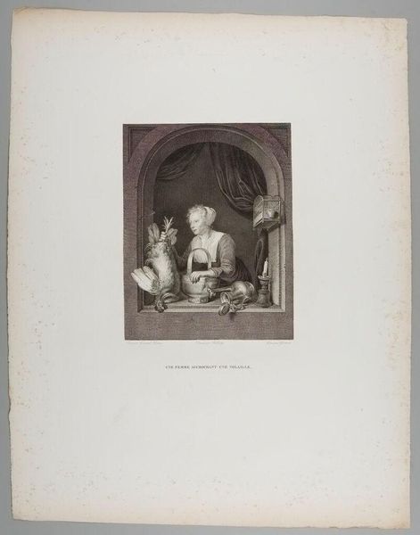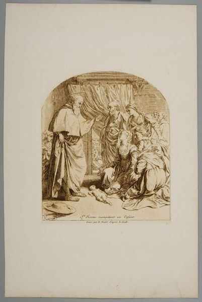 Curator: Bartolomeo Pinelli's etching, "Place called the 'Seven Halls'," presents a stark, shadowy view of Roman ruins. The heavy use of chiaroscuro creates a dramatic, almost theatrical atmosphere. Editor: It evokes a sense of historical weight, doesn't it? The monks seem dwarfed by the architecture, almost as if time itself is a character in the scene. Curator: Precisely, the composition guides the eye through a series of arches, drawing us deeper into the space. This layering also creates a fascinating play of light and shadow, emphasizing the monumentality of the structure. Editor: And the choice of figures surely reinforces the Church's enduring presence amidst decaying grandeur. Pinelli's commentary on institutional resilience is subtle yet poignant. Curator: Indeed, the contrasting textures—rough stone versus the smooth garments—add visual interest. Overall, a very sophisticated manipulation of form and light. Editor: A haunting depiction, prompting reflection on the interplay between past and present, power and decay. Curator: A compelling study in contrasts.