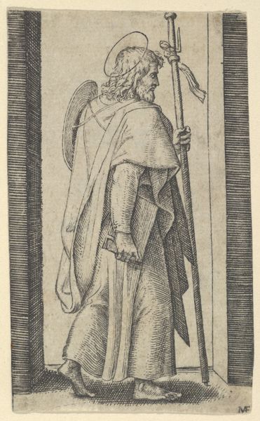 Editor: This is Sebald Beham's engraving of Saint Nicholas. The fine lines used to depict the saint's robes are truly incredible. I'm fascinated by how much texture he's created with just simple lines. What do you make of this print? Curator: Looking at Beham's Saint Nicholas, I'm drawn to consider the materiality of its production. As an engraving, this image was not simply "painted" into being, but rather, meticulously incised. How do the demands of the printmaking process - the labor, the tools - inform the aesthetic we see here? Editor: That’s an interesting perspective. I guess I hadn’t considered the labour involved in the process itself, beyond the skill required for the likeness. Curator: Exactly! Think about the engraver's tools, the plates they used, and the accessibility of this medium during the Northern Renaissance. This image wouldn't have existed in the same way without the specific materials and methods of production. Editor: So, the choice of engraving isn't just about artistic preference, but about the accessibility of that material, its cost, and the artist’s skillset. Curator: Precisely. This engraving allowed for a wider dissemination of religious imagery. Considering printmaking democratized image distribution at this time, does that alter your interpretation of its role? Editor: It does! The mass production aspect adds another layer, thinking about who this image was for, beyond the wealthy patrons of painting. It makes you think about art in early modern Europe as being not only devotion or luxury, but accessible and more readily disseminated than ever before, influencing everyday people and the rising middle classes, possibly influencing social behaviors. Curator: Yes, this understanding shifts our attention from the singular image to its potential impact within a broader socio-economic and cultural context. I think considering material processes really forces one to move away from aesthetic analysis only. Editor: I agree! Seeing the materials and production processes informs a much richer understanding than simply the look of the image.