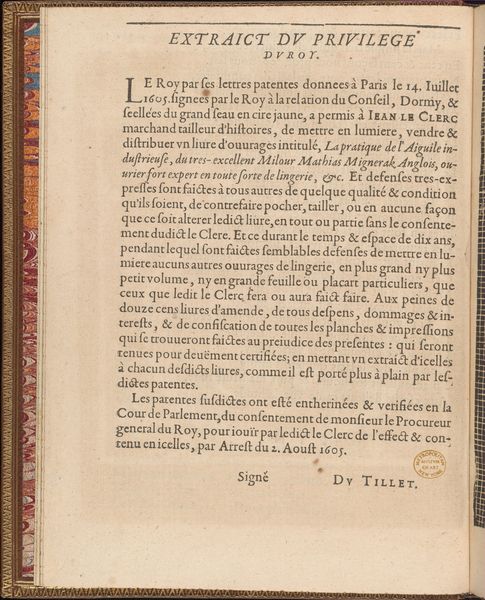 This is page four (verso) of "Les Secondes Oeuvres, et Subtiles Inventions De Lingerie du Seigneur Federic de Vinciolo Venitien." Published in 1603, it's an example of early modern European pattern books, printed using letterpress. Printed matter was often subject to royal oversight. This page reproduces the “privilege” granted to Jean le Clerc, the printer, to produce this book. It protects his right to be the sole publisher of Federico de Vinciolo’s designs for six years. Note how “Madame” is given title. This points to how the book’s creation was influenced by the patronage system and dedicated to a noble woman. Privileges and dedications in books from this time provide a glimpse into the economic and social structures that influenced the creation and dissemination of visual culture. The emotional dimension of the piece is tied to the labor and economic investment it represents. It also underlines the intricate web of power relations between artists, printers, patrons, and the monarchy.