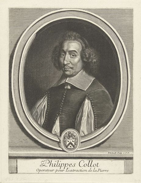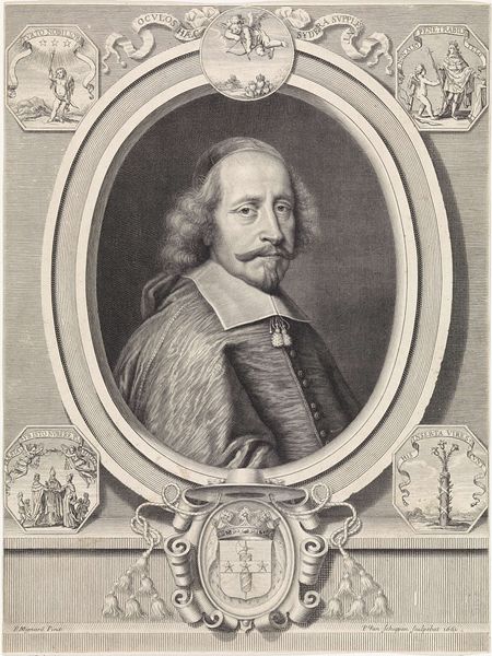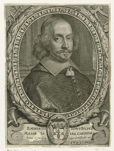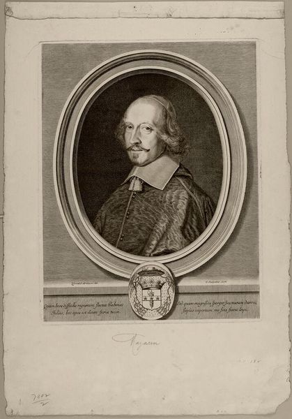 Curator: Here we have a striking portrait of Jules Mazarin, created in 1652 by Robert Nanteuil. It's an engraving, a print of the Baroque era, found here at the Rijksmuseum. What captures your attention first? Editor: Oh, the gaze. It's piercing, like he's trying to see straight through you. There's also a sort of weariness there. Makes you wonder what he's been through. Plus, the detailing is pretty spectacular for a print, no? Curator: Absolutely. Nanteuil was a master of capturing likeness, and indeed, Mazarin was a powerful figure in French politics, serving as a cardinal and chief minister during a turbulent time. The elegance of the line work, very academic in its presentation, highlights the finery of his robes and that captivating collar. Editor: It's interesting that you mention turbulent times because although the detail and lines of his face feel so soft and painterly for an engraving, there's this undeniable rigidity about his shoulders, in the line of his mouth. You can just sense he's trying to present this collected exterior amidst inner chaos, whether political or personal. Curator: That controlled public image was vital for someone like Mazarin. Think of the Fronde uprisings, the complex negotiations of the Peace of Westphalia... these events shaped his character. The portrait, presented in an oval frame, seems to suggest confinement. The added cartouche with his coat of arms hints to lineage and solidifies his authority. Editor: Confinement, yeah, but maybe he has placed himself there... Perhaps he used the appearance of calm collected authority to confine others. Either way, it works and it's beautiful! Looking at his gaze again, it’s more a careful consideration than weariness I would now say. Thanks for setting some context there, you changed my read. Curator: I'm so glad. Robert Nanteuil, through this academic but lovely approach to portraiture, provides more than a snapshot. It’s a layered encounter with a historical figure. Editor: Indeed! Now, I am going to go buy that man a strong cappuccino, so that he can smile once in a while, even if only for me. Thanks!
