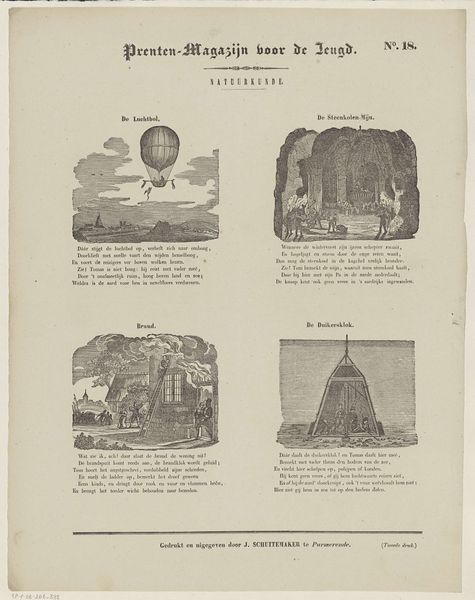 This print, made by Jan Schuitemaker, presents four vignettes rendered with delicate lines and subtle washes of colour. Each scene is framed distinctly, yet the overall composition invites us to consider the relationships between them. Notice the contrast between the aerial perspective of the balloon and the earthbound activities of mining and firefighting, all linked by human endeavour. Even the diving bell, submerged yet tethered, fits into this network of exploration and extraction. The artist uses a limited palette, allowing the forms to define the narrative. The scenes are not merely representational but symbolic, suggesting an emerging worldview shaped by scientific inquiry and industrial progress. The print invites reflection on humanity’s relationship with nature. Are these scenes harmonious or exploitative? Schuitemaker poses questions about our place in the natural order.