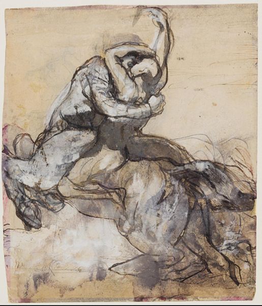 Editor: This is John Singer Sargent's watercolor and gouache, "Sketch of Cellini’s ‘Perseus.’" It has this fleeting, almost ghost-like quality, but still manages to capture the raw power of the original sculpture. What’s your take on this study? Curator: This drawing offers us a glimpse into the art world of the late 19th century and its fascination with the Renaissance. Artists like Sargent engaged with masterpieces not just for aesthetic inspiration, but as part of a larger project of cultural understanding. Consider the politics of display, even in sketch form, how does rendering Cellini's Perseus, a symbol of Florentine power, contribute to or challenge prevailing notions of artistic authority? Editor: That’s a great point. I hadn’t considered how choosing to represent this specific sculpture could make a statement. Do you think the medium – watercolor – has any significance? Curator: Absolutely. Watercolor, with its fluid, almost ephemeral quality, stands in contrast to the solidity of bronze sculpture. Sargent's choice might suggest a democratization of art, moving it from the realm of the monumental and public to the more intimate sphere of study and observation. It also hints at the evolving role of art education, where copying from masters was a key skill. How does it make you reflect on the power structures within art? Editor: It makes me think about who has access to these artworks, both as an artist creating a copy and as a viewer engaging with the image. I’m also considering that sculptures like Cellini's 'Perseus' were often created with the patronage of powerful families such as the Medici; do you believe the social and political history in these artworks continue to hold relevance for viewers today? Curator: Undoubtedly, Sargent’s sketch invites us to critically examine how we engage with art history, considering issues of power, access, and representation that resonate even now. Editor: That really changed my understanding. It's more than just a copy, but a comment on art itself. Curator: Precisely. It showcases the dialogues across centuries and the enduring impact of socio-political contexts on artistic production.