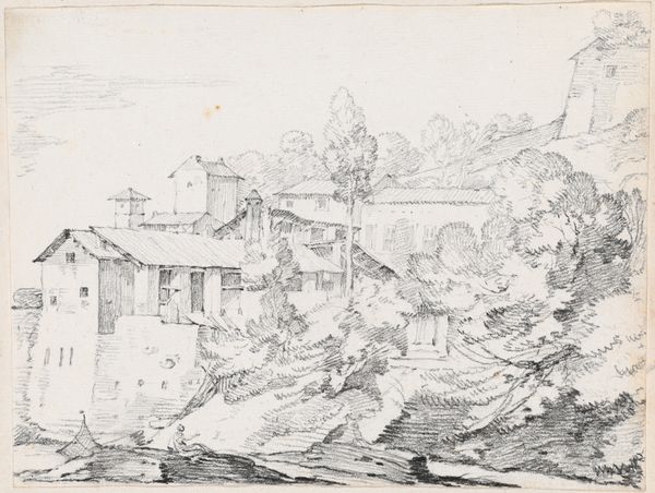 Curator: This is an ink drawing titled "Corte," by S. Vrain. It’s presented as a print and portrays a cityscape in a realist style. What strikes you first about it? Editor: Immediately, the contrast. The harsh lines create an almost brutalist landscape, even though the subject matter—a hillside village—seems inherently peaceful. The light feels almost aggressively bright. Curator: Interesting. I see your point about the light. Formally, I'm drawn to the use of hatching and cross-hatching. See how Vrain builds tone and texture using only linear marks? There's a strong sense of depth created purely through the density and direction of those lines. Editor: Absolutely, but isn't it more than just technical skill? The high vantage point offers a panoramic view but also perhaps subtly communicates a position of power, watching over this little town. Are we meant to feel a sense of control? Or is it just a picturesque scene devoid of such subtext? Curator: It's difficult to ignore that implied perspective, knowing art history's penchant for imbuing landscapes with symbolic weight. Also, note how Vrain emphasizes geometric shapes in nature. The buildings almost become extensions of the craggy rocks. Editor: Right, the jagged geometry almost dominates the human element, except there’s a figure down in the village with their donkey which returns a semblance of softness in the rigid artwork. How does the presence or absence of people influence our engagement with cityscapes over time? Does it reinforce notions of control versus communal identity? Curator: Indeed. The positioning and comparative scale makes one feel a feeling of insignificance in the realm of the natural landscape that’s highlighted. Editor: Thanks for sharing your insightful technical and structural overview, and for pushing me to reconsider the context around this composition. Curator: Thank you for pointing out how power and context might change how viewers engage with “Corte”.
