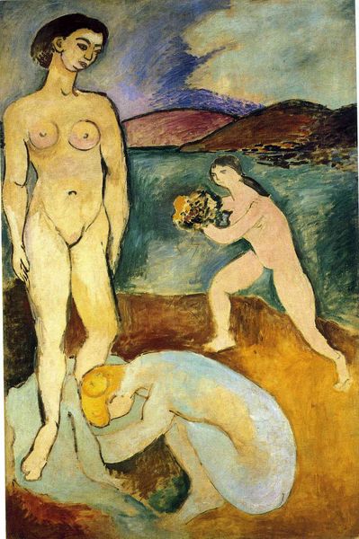 Curator: Before us, we have Henri Matisse's "Bathers with a Turtle," painted around 1908. Art Historian: My initial reaction is… odd. The stark, simplified forms of the figures feel both monumental and unsettling, especially with that muted, almost lurid color palette. It's far removed from idealized portrayals of the nude. Curator: Precisely. The composition itself is intriguing. Matisse abandons traditional perspective; the background is just planes of color suggesting water and sky. He’s flattening the pictorial space, emphasizing the surface qualities of the painting itself. Look at those abrupt color shifts. Art Historian: And it comes during a critical period! Early 20th century Europe was changing rapidly. Think about the burgeoning interest in ethnographic studies, and the Western gaze turning toward non-Western cultures. There’s an element of primitivism at play here – a search for a raw, untamed energy. Curator: Perhaps, but let's also appreciate the purely formal elements. See how Matisse uses line? It's deliberately crude and evocative, almost child-like. These simplified lines against blocks of arbitrary, discordant colour make the painting quite expressive. Art Historian: It’s impossible to ignore the painting's cultural implications, though. The bathers are stripped bare—literally and metaphorically—and presented in this unidealized state. The positioning around a reptile feels unsettling—deliberately confrontational towards the establishment. And with public fascination with Baudelairean ideals, these stark choices read as radical. Curator: Perhaps both? Maybe these 'Bathers' signify an essential search for something more… elementary, a distilled form and primal colour? The turtle seems the point of action as they interact with this little living object—which offers both structure and contrast within the picture. It anchors the dynamism on display and hints at the primitive world—nature. Art Historian: Well, whichever angle, its impact and significance endure, questioning Western conventions in a way that challenged the establishment's comfortable presumptions about art, gender, and civilization. Curator: A most thought-provoking juxtaposition. Let us now consider this painting in a fresh, enlightened light.