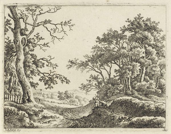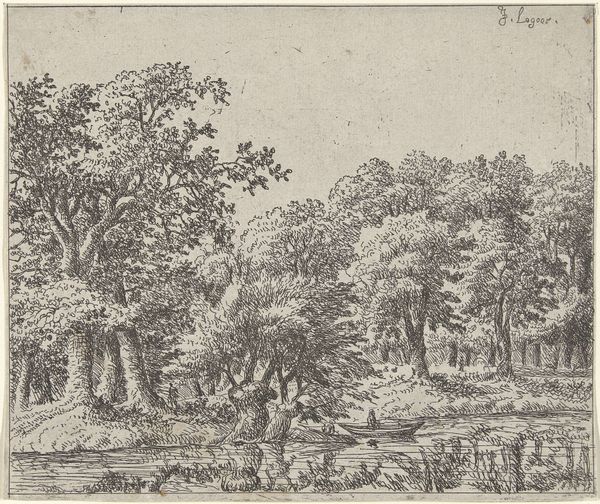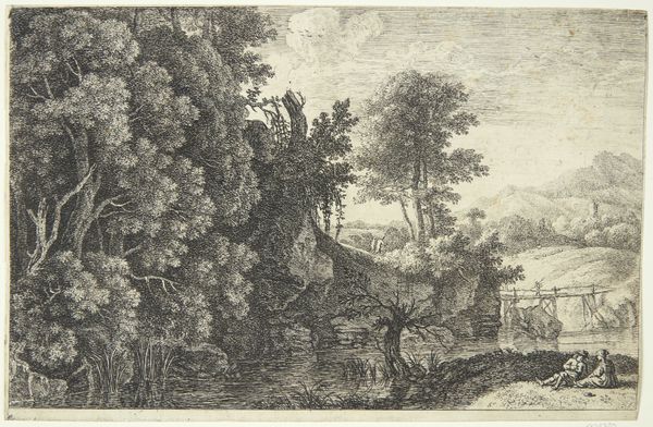 Editor: This is "Landscape with a River" by Franciscus de Neve, created between 1660 and 1666. It's an etching, an intaglio print. What strikes me is how detailed it is for a print – all those tiny lines creating texture and depth. What stands out to you? Curator: For me, the intrigue lies in considering how this image circulates as a commodity. Etchings like these were produced in multiples. So, who was the intended consumer, and what did possessing a 'landscape' mean to them? Were these images meant to ennoble one’s household by signaling classical and humanist virtues? Editor: That’s interesting. So, rather than focusing on de Neve’s artistic vision, you're more interested in the economic and social factors around the print’s production and reception? Curator: Precisely. Consider the labor involved – the etcher, the printer, perhaps even the individuals involved in distributing the prints. This image wasn’t created in a vacuum. Each line speaks to the material conditions of its making, and how these small images acted like vehicles of meaning for specific audiences. We are prompted to rethink our usual approach to “art” as somehow detached from material circumstance. Editor: So, the value isn’t just in the aesthetic quality of the landscape itself, but also in what the object represents about the society that created and consumed it. It seems the means of production become the subject in their own right. Curator: Exactly. It invites us to see beyond the romantic vision of the lone artist creating purely from inspiration and consider all of those who helped de Neve translate an image to a reproducible product. Editor: I hadn’t considered that so many people could have been involved, or the original intention in buying one of these prints. Now I'm curious who had access to these. Thank you! Curator: It changes how we read the image, doesn't it? Seeing art this way always brings exciting new angles of perspective and challenges preconceptions.