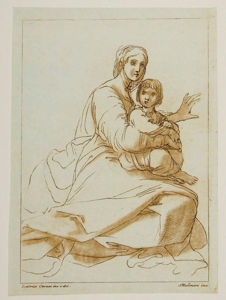 Editor: Here we have an interesting print, "Madonna and Child" by Guido Reni. I find the quiet intimacy of the scene quite touching, but also a bit unsettling given the religious context. What do you see in this piece? Curator: It’s the raw humanity amidst divinity, isn't it? Reni captures a tender moment, yes, but with a directness that almost feels… scandalous for its time. It’s not idealized. It’s a mother feeding her child. The halos feel almost like an afterthought. What do you make of the inscription at the bottom? Editor: I confess I don't know Latin... Curator: "Lactasti sacro ubere"—"Thou hast given suck from thy sacred breast." It elevates the everyday act to the divine. Reni is asking us: what is more sacred than this? Editor: That gives me a lot to think about. Curator: It certainly makes you reflect on the sacred.