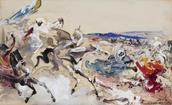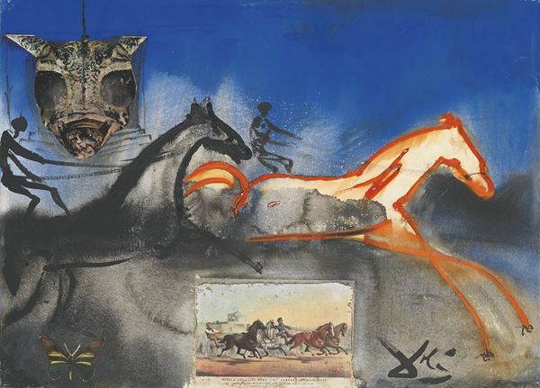 This watercolour, entitled 'Scorgemmo una cinquantina di cavalieri … una moltitudine di uomini a cavallo' was created by Salvador Dalí in 1963. The painting depicts a chaotic scene dominated by dynamic, fluid forms and a muted colour palette punctuated by vibrant splashes. Dalí’s rendering of knights and horses merges abstraction with figuration. Look closely, and you can see how the composition’s energy emerges through a network of layered washes and spontaneous brushstrokes. Notice the skeletal figure to the right, its stark form acting as a counterpoint to the frenzied movement elsewhere. The artist masterfully uses line and colour to create a sense of depth and disorder. Dalí's method destabilizes traditional representation by presenting an event not as a clear narrative but as a flux of perceptions. The lack of precise detail invites viewers to project their interpretations onto the canvas. This watercolour exemplifies how Dalí explores the subconscious, challenging fixed meanings and engaging with the fluidity of perception.