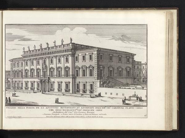 Curator: What a precise and fascinating rendering. This engraving, created around 1699 by Alessandro Specchi, depicts the Collegio Romano in Rome. The artist's skill with line work is just stunning. Editor: The scale is astonishing. The sheer size of the Collegio dominates the scene, giving me an immediate sense of its institutional weight. It also highlights the social engineering inherent in Baroque architecture, dictating power through space. Curator: The symbolic architecture tells quite a story. Notice the cross atop the cupola, acting as a visual reminder of the religious foundation of this educational institution. These lines and geometric forms resonate with power. Editor: Exactly, but let's consider the means of creating this print, the very labor embedded in the production. It reflects the engraver's process, the tools and time used to transfer the building’s imposing presence onto paper, which will become widely distributed. Curator: Good point! These prints would have served a similar function as photographs or postcards. Notice the figures populating the foreground? Each grouping almost seems like an archetype for Roman society during the late Baroque. Look at that regal horse drawn coach there in the right corner! Editor: And that horse drawn carriage also shows that this isn’t just an isolated structure. Look how the figures lead our eyes into an urban landscape. I’m compelled by the interplay between the labor required for building and its accessibility as a commodity to the masses. It prompts the consumption and dissemination of images and ideas. Curator: Indeed. By analyzing these visual devices—the cross, the light, the composition— we get a glimpse of cultural beliefs of this historical context, beliefs that were embedded in education itself. Editor: Considering both its symbolic weight and the physical materiality in engraving gives the context more depth and historical scope for approaching its significance and power today. Curator: It's intriguing how one can derive so much information by exploring what appears to be, at first glance, a fairly straightforward depiction of a building. Editor: Precisely. It forces me to consider its journey, how many hands it went through, how many places it traveled. Materiality makes art part of everyday life, part of larger patterns of culture, labor, and consumption.