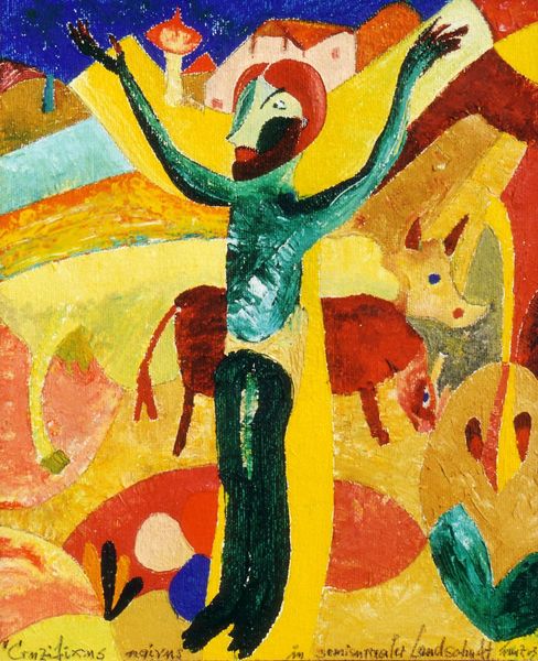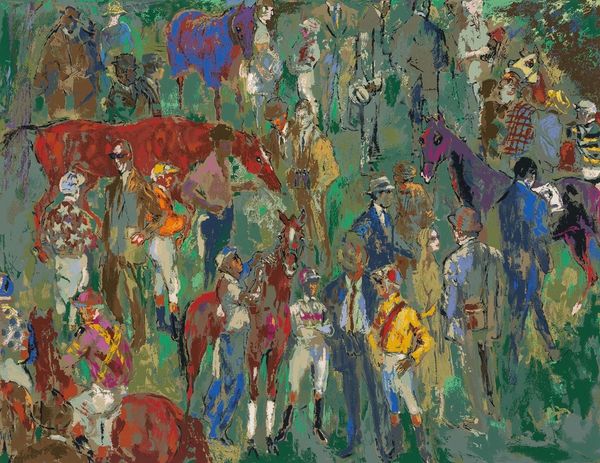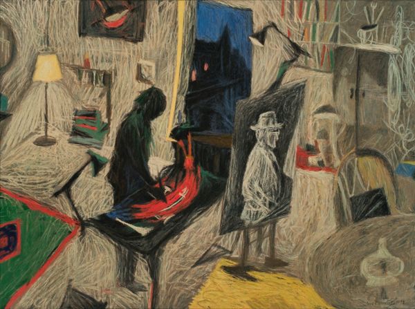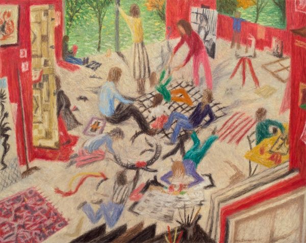 Editor: This is John Christensen's "Gadebillede," created in 1932, using pastel on paper. The circus scene definitely evokes a feeling of unease. It’s far from the joyful spectacle I usually associate with circuses. What do you make of it? Curator: That’s a crucial starting point. Consider the historical context: 1932. The shadow of the Great Depression looms large, and the rise of fascism is creating widespread anxiety. The distorted figures, the melancholic clown, and the chaotic composition all speak to a world teetering on the edge. Editor: So, you see this painting as a reflection of societal anxieties? Curator: Precisely. Christensen uses the circus, traditionally a space of escapism, to mirror the instability of the era. The clown, instead of being a source of laughter, becomes a symbol of vulnerability, perhaps even a critique of those in power who mask the suffering of the masses. The other performers look trapped, confined in this performance of normalcy, if you can call it that. How does the application of pastel work, specifically, underscore this unease? Editor: It feels almost like a sketch, unfinished and raw. It doesn’t have the polished finish you might expect. Curator: Exactly! That immediacy enhances the sense of urgency and disquiet. It’s as if Christensen is compelled to capture the anxieties of the moment before they overwhelm him. What happens when we also view the sexualised nature of some of the performers, next to animal cruelty and melancholic expressions, through the lens of contemporary intersectional theories of oppression? How do these symbols converge? Editor: It’s forcing us to recognise that these types of expressions don’t stand in isolation of each other, but are a larger problem. Seeing it in a single frame brings awareness to this pattern of inequality. I didn't even notice these details until you prompted me. Curator: It's about deconstructing the image to reveal the underlying social commentary. Art can hold a mirror up to power structures. Now, knowing all this, how would you describe the overall mood? Editor: I'd say it's a powerful expression of a society in crisis, using the circus as a stage to expose underlying vulnerabilities.