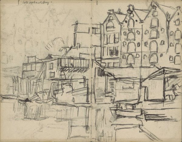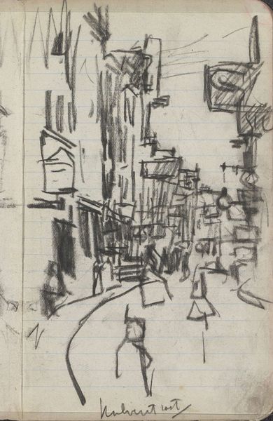 Curator: Here we have George Hendrik Breitner's "Gebouwen aan het Beurspleintje te Amsterdam, gezien vanuit Hotel Polen (Rokin 14)," dating from around 1886 to 1912. It's a drawing using pencil. Editor: It feels incredibly transient, like a fleeting observation captured on the spot. There’s a nervous energy in the quick, light strokes that give it a real sense of immediacy. Curator: Breitner, as a committed urban observer, often depicted Amsterdam's city life. Viewing it through a contemporary lens, how can we consider the social and economic strata reflected in his urban sketches? The emerging modern metropolis clearly shapes the identities represented. Editor: Yes, but beyond the surface level, I see a city still grappling with its identity. The buildings, rendered so simply, seem to be dissolving into the background, overshadowed by these stark, looming poles and human forms. The vertical lines of the figures dominate the drawing's geometry, underscoring their role and stature. Curator: Exactly! The choice to sketch this specific location becomes a conscious act, implicitly commenting on Amsterdam's urban expansion and how specific inhabitants navigate that transformation. Breitner captures a city's evolution and all its attendant issues. Editor: I agree; it’s like he has stripped the city bare to reveal its soul, using lines like whispered secrets. There's also an element of performance in its quick execution. It's raw but potent; there are not hidden symbols but rather unrefined symbols emerging. Curator: And we need to ask how such rapid urban changes affected social dynamics; we cannot isolate aesthetics from the broader social transformations witnessed at the time. Who could access those new spaces? Editor: Looking at it, I'm reminded of how artistic styles shift over time. Here the visual vocabulary feels connected to the shifting perspectives in our culture today. The sketch still provides context in new ways. Curator: Absolutely. These quick notations remind us that even spontaneous, impressionistic work is rooted in lived experience and conveys very specific meanings. Editor: For me, it will always speak of finding emotional anchors in a sea of modernity. Curator: A potent reminder that art, in all its forms, captures fleeting moments that still resonate deeply with the zeitgeist.