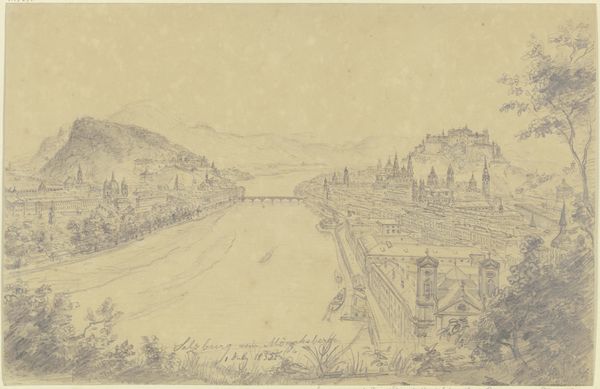 Curator: Before us, we have Wolf Huber's delicate drawing, "View of Passau." It's an Indian ink, chalk, and ink sketch currently housed at the Städel Museum. What strikes you first? Editor: The sheer quiet of it. It’s almost dreamlike, as if the city is resting beneath a veil. A place I know and long for all at once. Curator: I find the composition incredibly sophisticated. The artist offers us this almost panoramic sweep, pulling us in gently from the foreground’s rolling hill into the detailed cityscape nestled beneath those soft mountains. There’s a subtle rhythm in how he guides the eye. Editor: Rhythm, absolutely. And consider Passau itself. Its architectural and natural landmarks—churches, fortresses—project a very distinctive image, one Huber knowingly embraces. Like a brandmark, immediately identifiable and yet utterly embedded in cultural memory. The buildings carry so much weight. Curator: Exactly! It captures Passau’s essence with what appears like such effortless precision, a testimony to a city perched at the confluence of three rivers! The skill lies not only in replication but distillation—presenting the very idea of Passau. I wonder, what does it omit, or subtly alter? Editor: What stories could that castle tell, if we could decipher all the iconography embedded within it? I feel Huber uses landscape and its monuments not merely for geographical representation but as vessels for shared experience, or communal narrative. How else would he convey so much character with a simple drawing? Curator: Perhaps he sees a quiet reflection of himself within the city’s own long, meandering story. Maybe there's even a dialogue here: the fleetingness of human observation juxtaposed with Passau's imposing longevity. Editor: It gives one pause. This quiet, understated work hums with resonance. The simplicity reveals surprising depths with each contemplation. Curator: Indeed. I'll carry the echo of this tranquil vista with me. Editor: And I'll hold onto how a few lines can speak volumes about history and place.