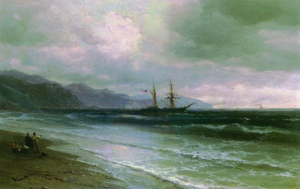 Curator: It's so peaceful, isn’t it? The stillness of the water, that golden light. A very picturesque scene. Editor: Indeed. This is William Bradford’s "Coast of Labrador," painted in 1870. Bradford was known for his Arctic scenes, documenting expeditions and whaling voyages. Curator: Whaling, yes. That does shift my perception slightly. Suddenly that lonely boat on the shore takes on a different significance. What was the economic and cultural impact of these whaling expeditions on the Inuit communities? How did they participate, resist, or get caught in the crossfire? Editor: Precisely. The romantic depiction often obscures the harsh realities and complex relationships involved. Bradford capitalized on a fascination with the Arctic, but his paintings also become documents of a specific moment of cultural exchange, and often, exploitation. Look at how the composition minimizes the Indigenous presence. Curator: True. We see a solitary structure on the coast, seemingly a trading post near the shore. But the focus remains resolutely on the dramatic sky and the untouched wilderness—very much in line with Romantic ideals of the sublime. It prompts the question of whose narrative dominates and who is marginalized in these landscapes. Editor: Exactly. The sublime in Romantic art often functioned to overshadow the social and political realities. How does this idealization serve colonial interests? It encourages us to critically examine these representations and deconstruct them to reveal what’s absent and what power dynamics are in play. Curator: It's fascinating how an initially serene image opens up so many complex layers when viewed through different lenses. It urges us to not only appreciate the aesthetic skill, but also the power of art to reflect and sometimes distort history. Editor: And how we, as viewers, carry the responsibility to unpack those distortions and understand the complete, often uncomfortable, narrative.