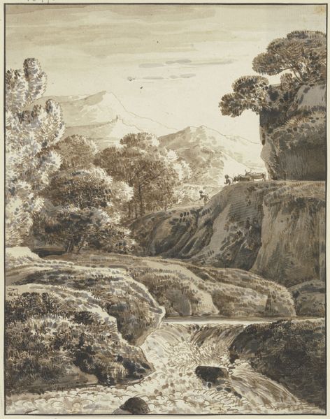 Editor: This is "Berglandschap met waterval tussen bomen, waarlangs een schaapherder zijn kudde voert," or "Mountainous Landscape with Waterfall among Trees, along which a Shepherd Leads His Flock," created by Gerard van Nijmegen in 1781, using ink and watercolor. I find the composition quite striking – the way the trees frame the waterfall, guiding the eye to the shepherd and his flock in the distance. What structural elements stand out to you? Curator: The formal arrangement is indeed noteworthy. Consider the contrast established between the solid, textured forms in the foreground – the rocks and trees – and the more ephemeral quality of the waterfall and the background landscape. The use of line, particularly in the trees, directs our gaze. Do you perceive how the artist manipulates tonal variations? Editor: Yes, the darker inks in the foreground create a sense of depth and immediacy, while the lighter washes in the distance create an almost dreamlike effect. Curator: Precisely. Van Nijmegen establishes spatial relationships and atmospheric perspective primarily through tonal control. Furthermore, let's observe the application of materials: the contrasting textures and optical effects from the fluid watercolours against the crisp linework of ink to achieve a certain aesthetic. How does the interaction of materials contribute to the overall impact? Editor: I see. The combination gives the piece a layered effect – almost like he's building up the scene from a skeleton of ink, adding depth and volume with the watercolor washes. So, the structure, colour, and materiality together shape our understanding. Curator: Indeed. It is through this strategic interplay of artistic means that a harmonious whole emerges. Editor: This analysis makes me appreciate the artist’s careful consideration of each element in building this captivating scene.