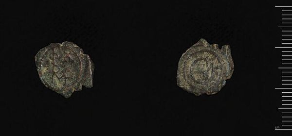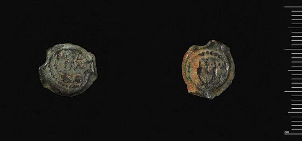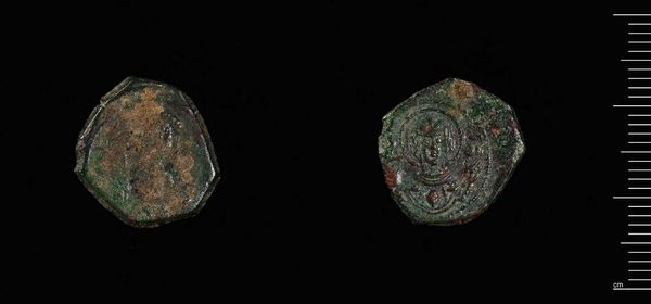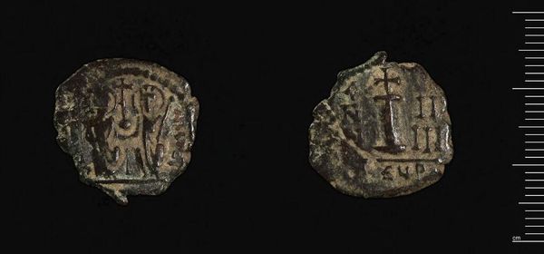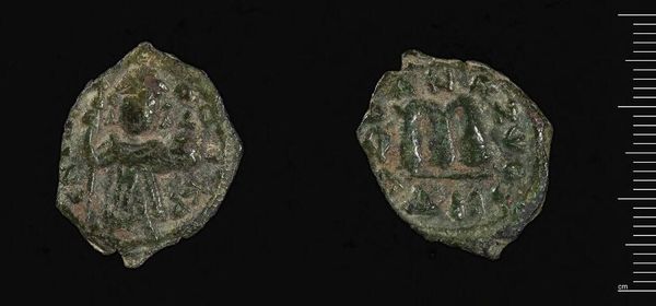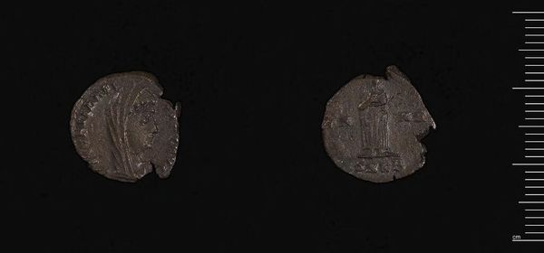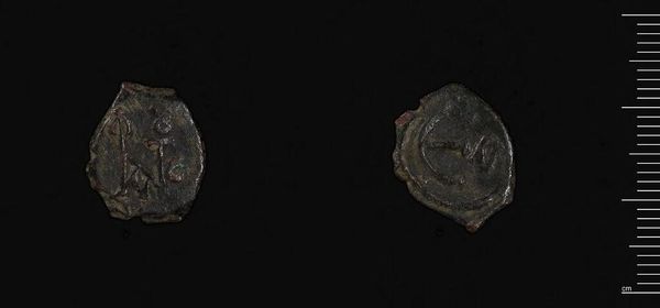Editor: This is a coin, attributed to Justin II. What strikes me is how these almost abstract symbols carry such weight, having represented power and legitimacy. What do you see in this piece? Curator: It’s fascinating how symbols condense cultural narratives. The crude imagery on this coin still evokes the memory of an empire. Can you imagine what these symbols meant to someone living at the time? Editor: Probably stability and continuity... or maybe just the weight of imperial authority. Curator: Exactly. The coin is not just money; it’s a portable piece of propaganda, loaded with meaning. It's quite powerful, even now. Editor: It really puts the staying power of symbols into perspective. Thanks! Curator: My pleasure. It is important to remember the power of symbols and their cultural context.