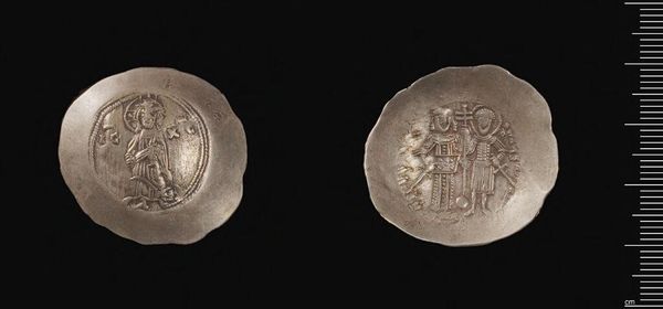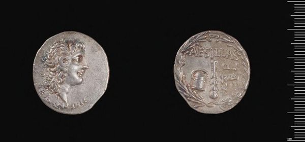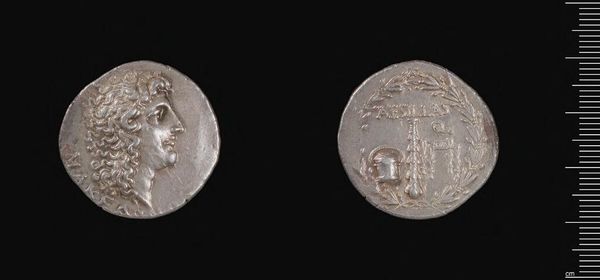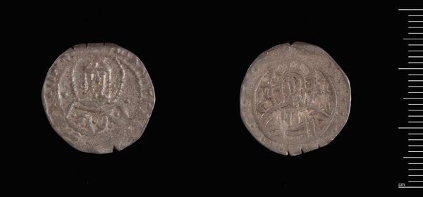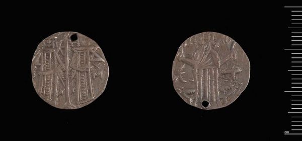 Curator: This is a silver dirhem, a coin minted during the reign of Khusrau II, likely in Gurgan. Its weight is a mere 3.96 grams. Editor: Even in this small scale, I sense the assertion of power typical of ruling elites; the crisp lines create a stoic effect. Curator: Precisely! Note how the obverse features the king's profile framed within concentric circles; above, a stylized winged crown. The reverse depicts two standing figures. Editor: I wonder about the statement being made through the relationship of those figures. What stories of diplomacy or power dynamics were circulated via these images? Curator: The consistent circular motif reinforces the completeness of royal authority. The details compress a potent message into a small medium. Editor: These are not simply aesthetic choices; they symbolize the ruler’s claim on resources and labor. Curator: Indeed. Studying the piece’s physical construction sheds light on the era’s aesthetic and political values. Editor: And it also underscores the inherent biases within historical records privileging those in power.