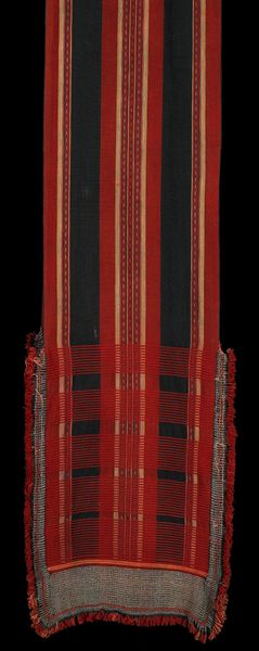 Editor: So, here we have what’s described as a Woman's Shoulder Mantle, a *mantita*, dating back to the late 19th century. It's attributed to the Aymara people and the medium is textile - fibre-art... Looking at it, I immediately get a sense of warmth from the earthy red tones. How do you see this piece, especially knowing a bit more about its origins? Curator: Well, aren't textiles stories whispered in thread? This isn't just cloth, it's a legacy woven with meaning. See the bold stripes? They're more than decorative; they likely represent social standing, kinship ties, perhaps even cosmological beliefs specific to the Aymara. It reminds me of staring into a campfire, trying to decipher the dancing flames. What emotions well up inside *you* when beholding it? Editor: That's a beautiful way to put it, really does makes it feel very intimate. For me it’s the neat little geometric designs woven between the stripes that add so much complexity. They're tiny, but repeated—insistent almost. Is there a significance to these particular geometric shapes, or is that a rabbit hole we could get lost in? Curator: Ah, the allure of the labyrinthine! You're spot on – those aren't merely decorative flourishes, sweet thing. While precise meanings can be elusive, passed down through generations without rigid documentation, we often see them echoing natural elements: mountains, perhaps, or stylized representations of animals vital to their culture, perhaps even the stars and cosmos. Imagine the stories that this piece can tell! They're visual poems embedded in wool, handed down through women, mothers teaching daughters a legacy they knew needed protection. Do you sense that also? Editor: Absolutely! Knowing a bit more, especially about the possible connection to the cosmos, the colors become less earthy and more... celestial, if that makes sense. Thanks, this helps reframe everything. Curator: My dear, art *is* reframing. And maybe now when we gaze upon it we, too, can listen to the whispers on the wind.