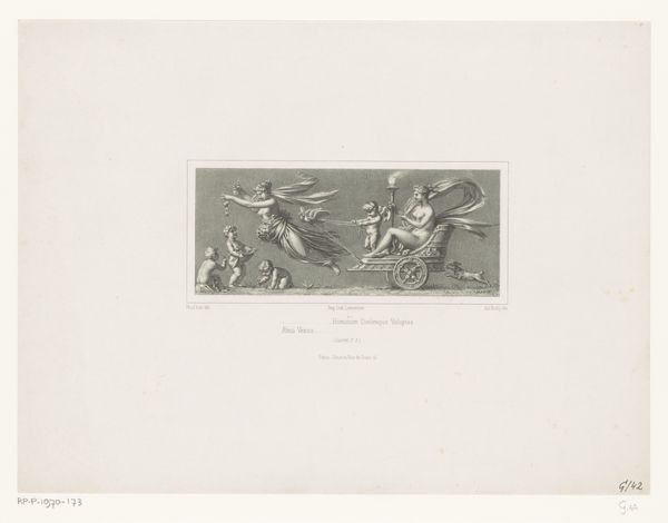 Curator: Here in gallery six, we're looking at "Triumph of Venus", a work realized around 1852 by Hyacinthe Aubry-Lecomte. It's an engraving and etching, a print, showcasing the goddess in her full glory. Editor: Immediately, the pale tonality gives it a dreamlike, almost ghostly quality, doesn't it? Like a vision emerging from a classical ruin. It reminds me a bit of faded frescoes or even antique cameos. What do you feel as you gaze upon it? Curator: It speaks to a desire to evoke antiquity, certainly. You have Venus enthroned in her chariot, cupids playing, and another figure, perhaps Pomona, scattering fruit, it all feels staged, allegorical. The symbolism is overt, pleasure, love, abundance, fertility, they all tumble around her. Editor: Yes! I agree it feels intentionally didactic— a pronouncement, rather than an exploration. What strikes me is how it encapsulates a particular 19th-century longing for an idealized past. Notice how the classical forms feel somewhat... restrained. Like a memory filtered through layers of polite society. Curator: Restrained perhaps in comparison to its Baroque predecessors, yes, but remember this work situates itself within the Neoclassical revival. The precision and clarity, typical of etching and engraving, aimed to capture an ‘authentic’ representation of antiquity based on archaeological discoveries and scholarly studies. Editor: Right, but isn't there also an undeniable sensuality? The nakedness, the flowing fabrics, the suggestive gestures—it is controlled, like a whisper rather than a shout, but there, under the surface. Are we invited to admire the Goddess of Love’s power, or to experience a more sensual delight? Or both? Curator: I think, ideally, Aubry-Lecomte hoped to blend those experiences, celebrating sensual joy under a veneer of neoclassical virtue, which certainly speaks to its period. To look closer for a second: see the crisp lines? He demonstrates a remarkable mastery of the engraving and etching techniques to capture light and texture. Editor: Absolutely. A fascinating piece—the contrast between its proclaimed purity of form and inherent sensual energy provides such a compelling conversation about longing and idealization, doesn’t it?