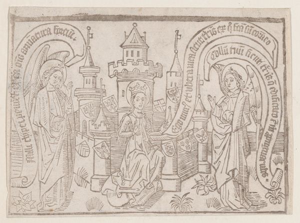 Curator: What a fascinating block print. This piece, dating from 1455 to 1465, is titled "The Bridegroom Offering a Crown to the Bride from a Canticum Canticorum blockbook, 2nd edition". It’s anonymous, a true product of its time, showcasing themes from the Song of Songs. Editor: It strikes me as oddly tender, yet formal. The figures are carefully delineated, but there’s something ethereal about the line work, a lightness that’s almost surprising given the religious context. Curator: Indeed. Considering its likely role in conveying biblical narratives to a largely illiterate population, the visual language here speaks volumes. Notice the deliberate staging of the scene and the stylized drapery; they aim to instill reverence. I would like to highlight the identities represented here, as there may be themes relating to patriarchal notions of power that inform these narratives. Editor: I agree. Thinking about the means of production—the laborious carving of the woodblock—it really emphasizes the collaborative aspect of medieval art-making. This isn’t just one artist's vision; it's the culmination of skills, resources, and patronage of many to realize the vision. Curator: Precisely. We can view the print as not just a religious image but as a tangible reflection of the societal structures. The iconography would dictate strict interpretations around duty, obligation, and social hierarchy for medieval people consuming the imagery. Editor: And looking closer, the roughness of the print gives a human touch; each impression slightly different. Imperfections in production would inevitably vary slightly with each block printed from the wood block, providing some differentiation to multiple uses of this imagery. This print serves not only a spiritual end, but it is a material testament to work in the print shop. Curator: The presentation is really interesting as well, how different artistic conventions affect different meanings. Editor: I find this block print to be a remarkable blend of artistic expression and societal imprinting. Its raw simplicity opens up an appreciation for process and societal intention in the Middle Ages. Curator: Ultimately, the print provides an opportunity for discussions on gender, religious roles, and societal implications, thereby continuing the impact it may have had in the fifteenth century.