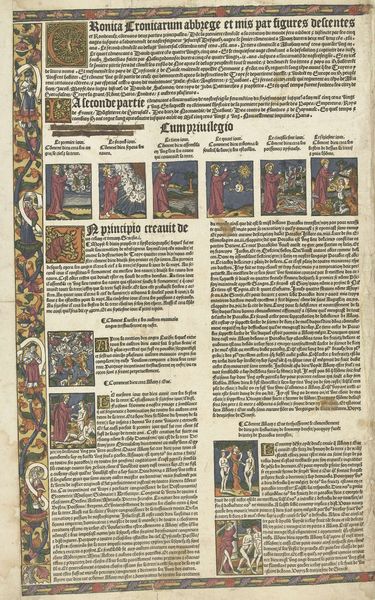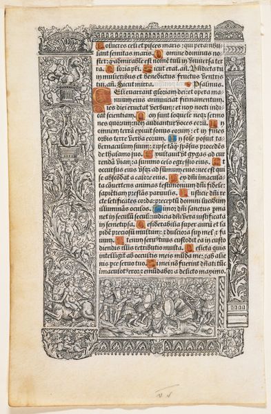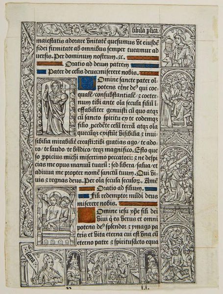 Editor: This is an Illuminated Page, dating back to around 1500 and attributed to Pigouchet. It seems to be a combination of drawing, gouache, and ink. The intricacy is really striking; it’s almost overwhelming at first glance. What do you see in this piece? Curator: The initial visual impact resides in the careful composition—observe how the artist juxtaposes different textures, weights of line, and intensities of color to produce distinct visual planes. Semiotic analysis reveals how this interplay enhances the page’s overall readability and significance. Editor: So you're saying the visual organization directs our understanding? Curator: Precisely. The contrasting densities of the illustrative vignettes and the textual script guide the eye and invite contemplative engagement. Consider the interplay between the geometric border, the naturalistic foliage, and the figurative scenes—each element contributes to a rich tapestry of symbolic meaning. Editor: It's interesting how you highlight the interaction between these different visual components, I hadn't really thought about it that way. Curator: Note the deliberate arrangement of text and image. How does this spatial ordering affect your experience of the artwork? Are certain words or figures emphasized by their placement? Editor: I can see now that the images and the text play off each other, creating a deeper level of meaning. Curator: And in doing so, reflect a unique sensibility that marries medieval traditions with the nascent influences of the Renaissance. Editor: It's fascinating to think about this page as not just a document, but a complex system of signs and symbols working together. Curator: Indeed, and the careful material execution adds yet another layer to our interpretation.