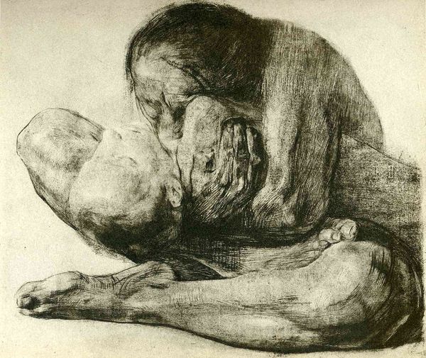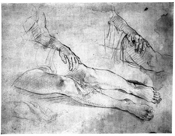 Editor: This drawing, "Study of Three Male Figures (after Raphael)" by Michelangelo, was made around 1530 using pencil. I’m immediately struck by how these figures seem entangled, almost struggling with one another. What do you see in this piece? Curator: I see a work deeply embedded in the social and political context of the Renaissance, particularly regarding the male body and power. Michelangelo's choice to study Raphael, his rival, through the depiction of male nudes is telling. The bodies aren’t simply aesthetic forms; they represent ideals of masculinity and strength that were crucial to the construction of Renaissance identity. Think about the role of the male nude in asserting dominance and control, both politically and artistically. Editor: So, it's not just about the artist improving their skill, but also about claiming power? Curator: Exactly. And consider the gaze here. Who is the intended viewer? In that historical moment, it would have certainly been a wealthy, educated, heterosexual man, likely someone connected to the centres of political or religious authority. This brings in questions of gender and sexuality, revealing the complexities within the social hierarchy of that time. How do you think we can challenge the historically-constructed viewer through our interpretations of this piece today? Editor: That’s fascinating. I always focused on the artistic technique but hadn't considered the social implications behind it. Curator: Thinking intersectionally, how do race and class affect our understanding of the drawing? Editor: That’s true! Considering who was able to access and commission art in that period… it completely changes how you view the power dynamics represented here. I will definitely reflect more on the societal implications rather than focusing on simply composition or aesthetic. Thanks for sharing. Curator: Precisely. Hopefully it will encourage you to look at how power, gender and identity shaped not just what art was created, but how art was accessed and valued in its historical moment.