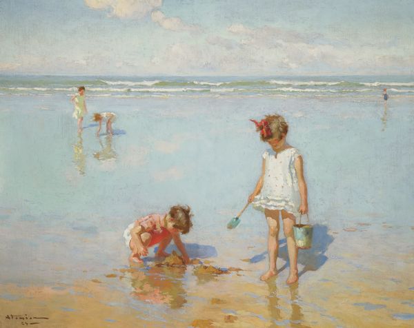 Curator: This is Isaac Israels' "At the Beach," painted in 1902, using oil on canvas. It has a certain ephemeral quality to it, doesn't it? Editor: It does! I’m struck by how light and airy it feels, even though the figures are quite grounded in their actions. What can you tell me about it? Curator: Let’s consider the materiality. The thick application of paint, those visible brushstrokes, suggest a rapid execution, en plein air as they say. How does that relate to the subject – ordinary people enjoying leisure time? Editor: I guess it connects to Impressionism, capturing a fleeting moment in everyday life? Curator: Precisely. Think about the social context too. The turn of the century saw the rise of a middle class with newfound leisure. Paintings like this reflect and arguably, celebrate that shift. But notice how the materials themselves are becoming the subject. Israels isn't just showing us *what* they are doing, but *how* he is capturing it on canvas, the physical act of painting is part of the message. Does the looseness of the painting affect its value as a commodity? Editor: It's interesting you bring that up. I suppose in a society that valued perfect imitation, it might have been less commercially viable, but as tastes evolved, perhaps the value shifted to capturing that sense of spontaneity. Curator: Exactly! The very act of painting, its speed and freedom, became a symbol of modern life itself. Israels is depicting not only the beach but his artistic method reflecting, even constructing the beach goer’s new values of pleasure and material access. Editor: That makes me see the painting in a completely new way – as an artwork but also as a historical document that is revealing artistic choices linked to social transformations. Curator: Yes! Seeing art this way allows us to critically understand production, meaning, and consumption within historical power dynamics. Editor: It definitely deepens my understanding beyond just surface level aesthetics!