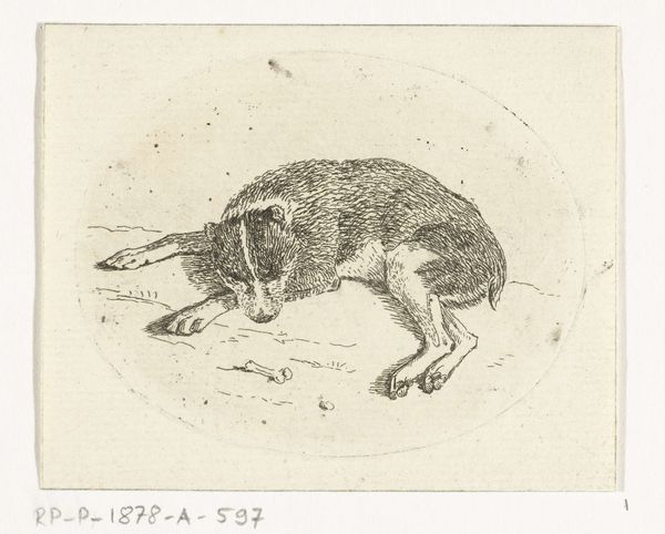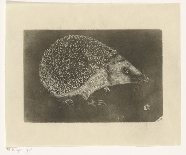 Editor: So this is "Egel," an etching by Jan Mankes, created in 1916. The dark background really makes the hedgehog stand out, but there’s also a quiet stillness to the piece. What's your interpretation of the cultural significance here? Curator: That stillness you noticed is interesting. Think about 1916 - World War I was raging. While some artists embraced avant-garde movements fueled by that chaos, Mankes retreats to a quieter observation of nature. It's an act of artistic resistance, focusing on the intimate and personal amidst widespread turmoil. Editor: So the choice of a simple hedgehog becomes significant? It isn’t just a random subject? Curator: Precisely. In focusing on this humble creature, Mankes rejects grand narratives. It becomes a symbolic act, reclaiming art for the everyday, and a reminder of the natural world amidst the destruction of the war. Also, consider the accessibility of the print medium itself. How does the use of printmaking contribute to his artistic aims, would you say? Editor: Well, being a print, it’s more easily reproducible. Making art like this could be seen as a democratic gesture, bringing beauty to a wider audience outside the elite art circles, right? Curator: Exactly. Mankes's art subtly challenged the prevailing notions of art's purpose during wartime, promoting quiet contemplation. Editor: I hadn’t thought about it in terms of resistance before. Thanks, it adds another layer of meaning. Curator: And recognizing that resistance helps us understand not just Mankes, but also the diverse responses artists had during periods of intense social upheaval.