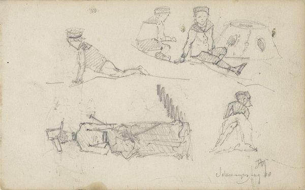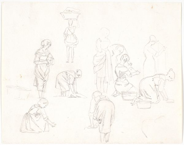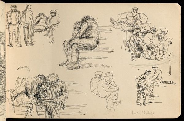 Editor: This is Claude-Joseph Vernet's ink drawing "Eight Studies of Figures and a Ship at Sea". It seems to be an assortment of men relaxing by the water. Some are sitting, some lying down. They're all doing very ordinary things and seemingly unaffected by the ship. What do you make of this drawing? Curator: What strikes me is how Vernet presents labor through the lens of leisure. These aren't idealized heroic figures, but ordinary sailors caught in moments of downtime. The question is, how much does the absence of a dramatic narrative reflect the social context of art production and consumption at the time? Was Vernet challenging or reinforcing the established power structures through these understated depictions of working men? Editor: So you're suggesting that portraying sailors relaxing instead of battling storms makes a subtle statement? Curator: Exactly! The depiction of the everyday carries political weight. Were these images destined for private collections, reinforcing a romantic view of maritime life, or were they more public-facing, offering a glimpse into the lives of ordinary sailors to a broader audience? Think about how artistic patronage shaped the kinds of stories being told, or not told. Editor: That's interesting! I didn't initially see the work as political. Now I wonder, are we meant to empathize with them? Curator: Precisely! Vernet provides multiple, close-up images of these working class figures in a way that does appear humanizing and perhaps empathetic. This artistic choice subtly invites reflection on the humanity of the subjects represented, which has broader social implications concerning visibility, representation, and perhaps even class dynamics. Editor: It’s fascinating to consider the socio-political forces shaping even a seemingly simple drawing. Thanks, I hadn’t thought of it that way. Curator: Absolutely. Art provides insight to our understanding of historical perspective and context. There’s always something deeper than what meets the eye.
