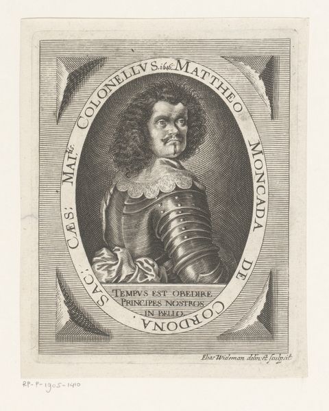 This is Jacob Matham’s portrait of Johannes Maas, an engraving rendered with careful detail. The tight composition immediately draws your eye, framing the figure in a diamond shape, itself set against a circular border teeming with inscriptions and heraldic symbols. Matham’s use of line is particularly striking. See how he uses hatching to sculpt Maas’ face and hair, creating volume and texture. The figure is framed by an inscribed decorative border. The lettering and graphic elements work together to create a dense, almost claustrophobic space. The portrait is more than just a likeness, it’s a carefully constructed statement about identity and status. The framing emphasizes the sitter's importance but also confines him within social and religious expectations. This tension between freedom and constraint speaks to the complex interplay of individual identity and social structures in the 17th century.