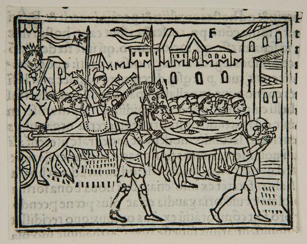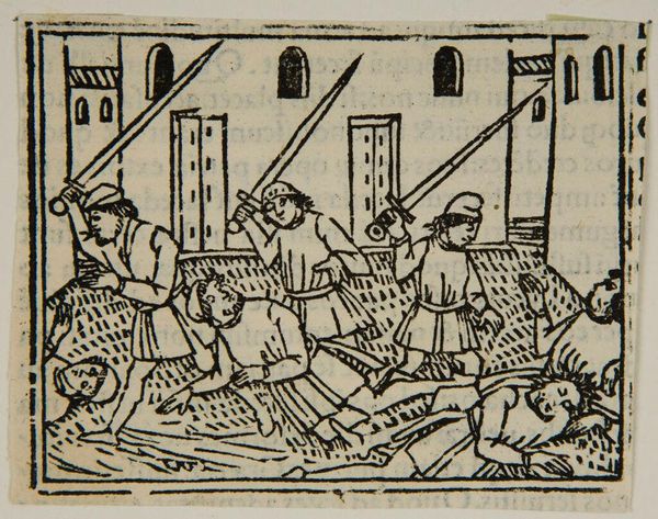 Editor: This woodcut print, "Book XXIII.44-45. Battle of Nola," depicts a scene of warfare, seemingly chaotic and violent, but also somewhat... theatrical? What can you tell me about its context? Curator: The reuse of this block to represent different events speaks volumes about the construction of historical narratives. Consider how this image, regardless of its accuracy, shapes perceptions of Roman military tactics and their interactions with other cultures. Does this commodification of imagery influence our understanding of power dynamics? Editor: So, the print's meaning isn't necessarily tied to the specific battle it depicts? Curator: Precisely. It’s about how visual culture perpetuates certain perspectives. Perhaps the artist was interested in the idea of conflict rather than documenting a specific truth. Editor: That's fascinating. Thanks for the insight!
