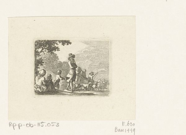 Curator: Welcome. Before us is Daniel Nikolaus Chodowiecki’s “Uittocht van het Turkse leger,” an engraving dating to 1790. It’s currently part of the Rijksmuseum collection. Editor: Immediately, I'm struck by the starkness of the line work. The almost clinical precision used to portray a rather grand historical subject feels…unexpected. The stark, almost ghostly pallor seems to subdue the figures. Curator: Indeed. Chodowiecki’s rigorous linearity defines his oeuvre. Note how each figure and animal are delineated with incredible economy of line, creating a scene both precise and somewhat distanced from emotionality. But to look at this print is to acknowledge the rise of enlightened historicism, and that art was very involved in representing military culture. Editor: True, the historical context is important. I do think this stylistic approach impacts how we read the content, though. It emphasizes the supposed clarity and objectivity in portraying history—a kind of dispassionate recording of events. However, the actual impact feels quite artificial. I find this approach a fascinating, almost proto-cinematic method to portraying war. Curator: I agree to some extent. But I feel that the overall compositional balance suggests it aims at something other than simple documentary effect. Observe the delicate interplay of dark and light, guiding our eye to appreciate its symmetrical order within this historical setting. And this piece surely spoke to Europe’s interest in the Ottoman Empire. It would speak to narratives of exotic otherness. Editor: Perhaps it attempts to do both. Chodowiecki seems caught between a desire for objective recording and romantic stylization. That contrast itself can speak volumes about that era’s perception of history. Also, notice that it's not really about battle: its more about procession, ritual, power... less about carnage. This reveals something too. Curator: The precision with which each figure is rendered makes a big impact. So considered. Editor: A fascinating artifact, prompting so much reflection on its method and meaning! Curator: It offers more nuance the longer we look!