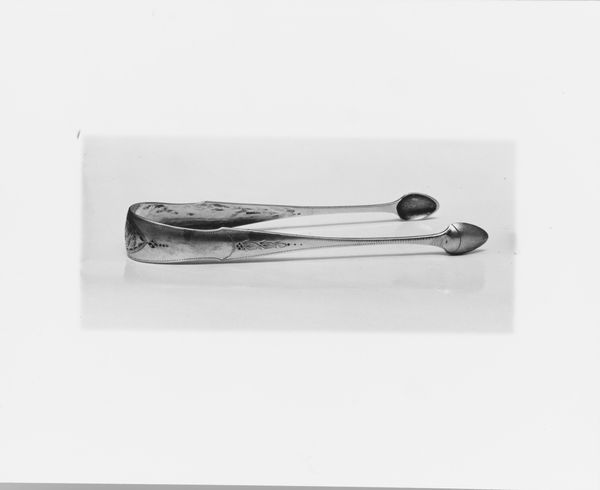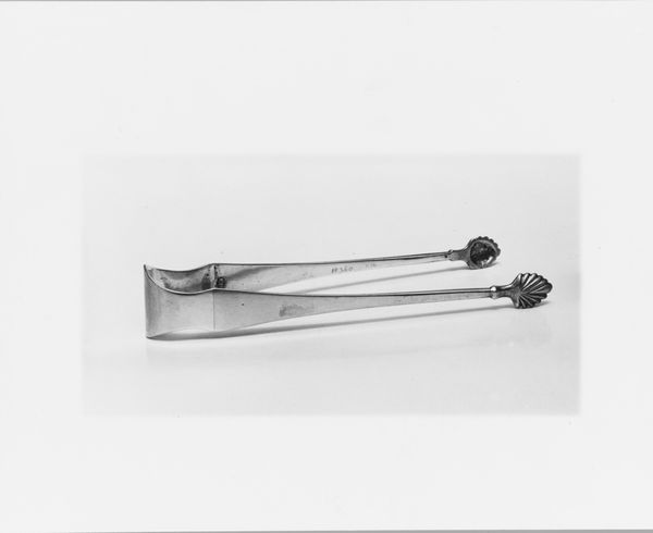These tongs were made by James Gaskins, a silversmith active in the late 18th and early 19th centuries. The stark monochrome image emphasizes the interplay of light and shadow on the silver surface. The tongs, with their delicate form, display a compelling duality. The linear precision of the shafts contrasts with the ornate floral engravings at the tips and geometric patterns near the hinge. This contrast destabilizes the functional object by drawing attention to its aesthetic qualities. The visual language here extends beyond mere utility. The object engages with semiotic codes of refinement and status through its material and embellishments, reflecting the cultural values of its time. These tongs function as a symbol of social distinction, subtly challenging the fixed categories of art and craft.