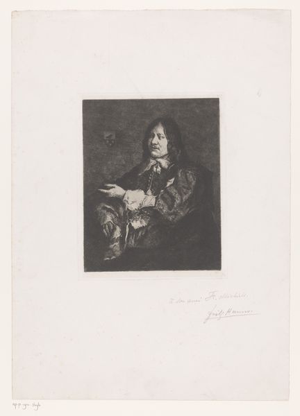 Curator: Here we have “Portret van onbekende man met een hoed”, or "Portrait of an Unknown Man with a Hat", created by William Unger between 1847 and 1889. It’s an etching, currently held here at the Rijksmuseum. What’s your immediate response to it? Editor: My first thought is just how relaxed he seems. He’s casually posed, gazing off, with what feels like a slightly bemused expression. The monochrome palette emphasizes the man's relaxed pose, like he hasn't got a worry in the world. Curator: That sense of ease definitely comes across. Given the period it was produced, it would fall within the artistic scope of realism. How do you think it engages with realism as a broader social project? Editor: In line with what you’ve said, the unidealized representation is central here. No flattering poses or costumes. The slightly rumpled hat and casual pose speak to a certain kind of everyday existence. Also, you see this attitude towards representation coming to life as class and identity take new roles in this timeframe. He’s part of this larger conversation about class and how to place yourself into social discourse. Curator: Yes, precisely. Unger seems less concerned with glorifying the sitter and more intent on capturing an authentic, candid likeness. There's a real tension in how realism functioned as an art movement and a kind of democratization of portraiture at the time. But he is an unknown man, which begs the question: who gets remembered and why? Editor: I agree, that is an astute and important question. Do you find the loose rendering empowering? Does the level of detail invite us in, or does it subtly maintain distance, reminding us we are only seeing the constructed portrait of this person and that maybe there is nothing more beyond this portrayal? Curator: I see your point about distance, especially regarding identity. But what's exciting to me is how that very distance opens up interpretive spaces. He’s almost anonymous. He seems comfortable with that status, inviting viewers to see themselves reflected. The open-ended nature of it is compelling, if we remember that accessibility does not come to everyone in the same capacity. Editor: It makes me wonder what an Unknown Woman would feel like in the same space. Anyway, it has been a pleasure discussing William Unger and his piece. Curator: Yes, an enriching discussion, reflecting on the work's quiet realism and social and historical resonances.
