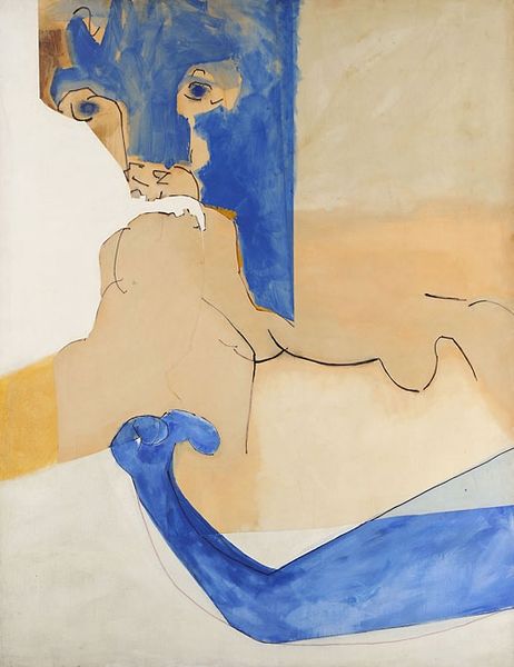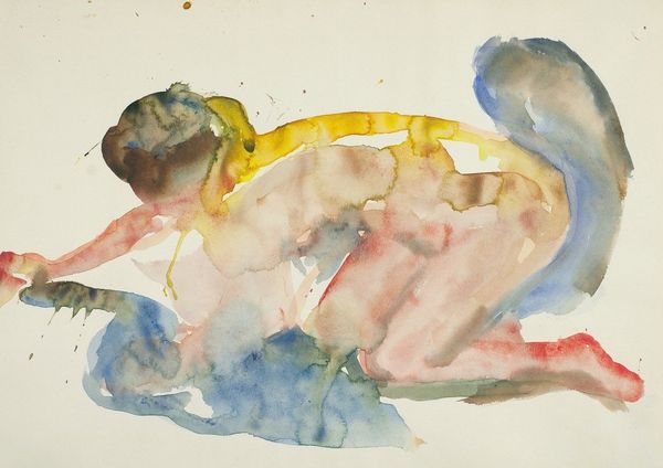 Editor: This is Edvard Munch's "Akt på sengen," or "Nude on the Bed," a watercolor made sometime between 1919 and 1924. I'm struck by how fragile and vulnerable the figure seems, almost dissolving into the white of the paper. How do you interpret this work in the context of Munch's larger oeuvre? Curator: The fragility you observe is key. This work arrives after periods of immense personal and social upheaval, following the First World War and Munch's own struggles with mental health. "Akt på sengen" challenges the male gaze, so common in depictions of the nude. The subject here isn’t presented for visual consumption, but seems lost in contemplation. What is she contemplating, do you think? Editor: Perhaps reflecting on those years of conflict or her own role within societal expectations? It almost feels like a resistance to being defined or objectified. Curator: Precisely. Consider Munch's exploration of psychological landscapes. How might his expressionistic style serve as a form of social critique, especially regarding the expectations placed on women's bodies and emotional experiences in his time? How does it speak to us now? Editor: It speaks to the continuing struggles many face today, to reclaim their identities against pressures of modern objectification and unrealistic standards of beauty. Curator: Exactly. Munch uses his art to give visual language to feelings. Even the seeming simplicity is deceptive; consider the power of the minimal color palette. It reinforces the vulnerability and exposes underlying anxieties that still resonate today. Editor: I never really thought about that – it really sheds a light on it! Thanks! Curator: And thank you; it’s vital to engage in dialogues that bridge the past and the present, prompting us to question established norms and the forces shaping our lives today.