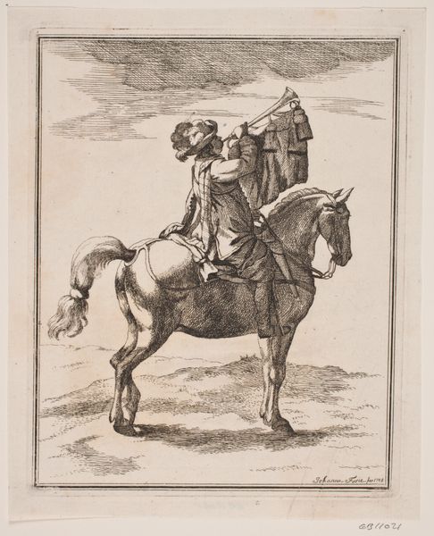 Stefano della Bella made this print of a Polish horseman with bow and arrow around the 1640s, as part of a series depicting cavaliers from different nations. It's fascinating to see how della Bella, an Italian artist, represents Polish identity through the lens of horsemanship and military prowess. This image encapsulates the early modern period's fascination with cultural types and the way people constructed notions of national identity. Poland at this time was known for its strong cavalry. Della Bella probably had access to visual sources depicting Polish military figures. The print may reflect both firsthand observation and existing European stereotypes about Poland. The print was published in Paris, which was a center of printmaking and book publishing in the 17th century, indicating that it was intended for widespread circulation. Understanding this print requires examining period sources such as military manuals, travel accounts, and costume books. By researching these resources, we can better understand the print in its cultural context.