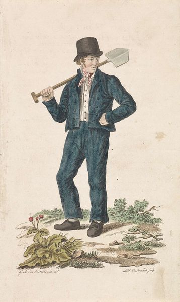 Editor: Here we have Bartholomeus Johannes van Hove's "Boy with Drawings Under His Arm," a watercolor from around 1824. I'm struck by how formal yet approachable it feels. It's like a snapshot, but from another era. What's your take on it? Curator: Well, isn't he a picture, quite literally! I always imagine what stories he could tell. Van Hove captures the moment perfectly, the boy’s hopeful air almost tangible. It whispers of Romanticism, doesn't it? The almost theatrical pose and delicate details, they pull you right into his little world. Look how deliberately he's chosen to show off the contents of the young boy's portfolio. I wonder what dreams lived within those drawings? Editor: So you think Van Hove wanted us to consider not just the boy, but also his artistic aspirations? Curator: Absolutely! Van Hove wasn't merely painting a portrait, but portraying potential. A spark of creativity that could change the world, one brushstroke at a time. It's a celebration of youthful ambition, framed by the gentle strokes of watercolor. What do you make of his expression? Editor: I find it hard to pinpoint; a bit shy, maybe even a touch melancholic. Curator: Precisely! And it’s that ambiguity, that hint of depth beyond the surface, that really grabs you. We all hold unspoken dreams and hesitations, don't we? It makes you wonder if he ever reached his artistic goals, or if this remains his most celebrated moment. Editor: This really brings the piece to life in a completely different way. Thanks! Curator: My pleasure! The joy is in letting these narratives unfold, wouldn’t you agree?
