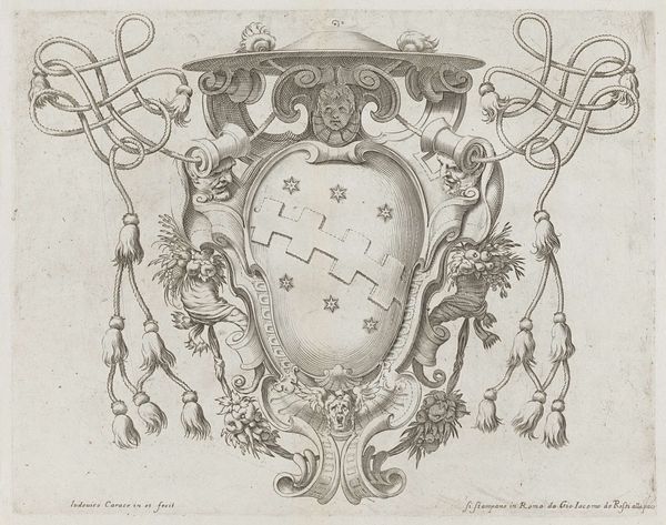 This print titled, "Venus en Amor flankeren een monogram," was made by Gerrit Visscher using etching techniques. The symmetrical design is immediately striking, a visual order constructed through intricate detailing. The ornate framework which encases two oval monograms evokes an emotional response of awe. In terms of semiotics, the symmetry and precise lines suggest balance and harmony, values that are reinforced through allegorical figures of Venus, representing love, and Amor, desire. The monogram itself becomes a coded message, its flowing script a signifier of identity and perhaps social status. The artist challenges the fixity of language by visually intertwining letters into an abstract design. The work can be understood within a broader artistic context in which Baroque artists aimed to destabilize established meanings through elaborate ornamentation. Ultimately, the precise line work is not merely decorative but functions as a medium through which cultural and philosophical ideals are communicated. It is through this calculated formal structure that the print finds its enduring value.