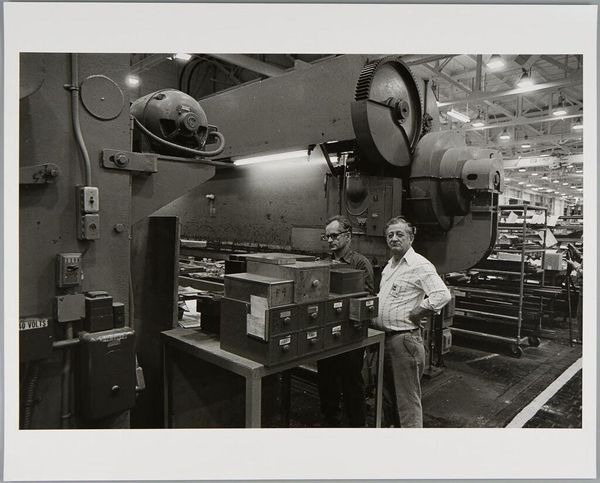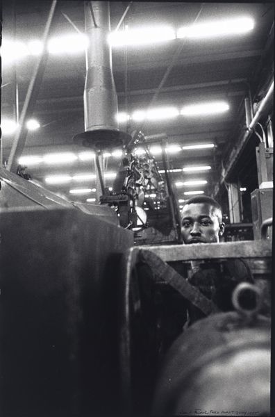 Curator: Bill Dane's small, silver gelatin print, "Untitled (Richmond, Cal)," has such a blue-collar feel. Editor: Exactly! It's a somber portrait, all grays and tired poses; he looks like he's waiting for quitting time. Curator: Dane often focused on the overlooked, capturing the quiet dignity of everyday labor. He distributed many of his photographs via postcard—an act of radical democratization. Editor: Interesting, he really captured the vibe of the working class, and you can see so much detail in the workers' uniform that would be easily ignored. It's a great picture. Curator: There's a certain poetry in finding beauty in the mundane. It makes you think. Editor: Absolutely. It's a testament to the power of photography to elevate the ordinary.