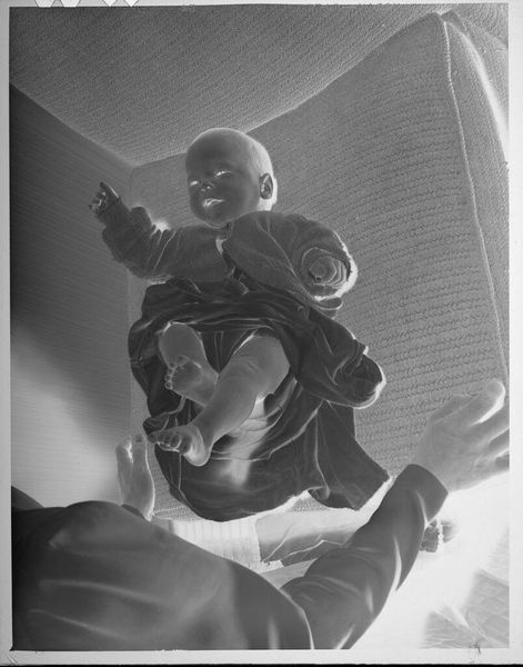 Editor: This fascinating little silver gelatin print, simply titled "Untitled (man holding child on shoulders)" by Lucian and Mary Brown, possesses an odd inverted quality. What's the emotional or cultural weight you see carried in this image? Curator: The inversion gives it a ghostly affect, doesn't it? But this familial image holds multiple layers. Note how the child is elevated, almost enthroned. The man's formality—suit, tie—suggests an attempt to create a sense of stability, despite the photograph's unsettling nature. Does it perhaps reflect a desire to preserve a fleeting moment of joy and connection? Editor: So, the image's formal elements, like the man's attire, and the inversion technique serve to underscore themes of family and preservation of memory? Curator: Precisely. Perhaps a visual memento mori, reminding us of life's ephemeral beauty. Editor: I see it now; the image's darkness makes it even more of a reminder. Curator: Indeed, it is not just a photo, but a potent cultural artifact.