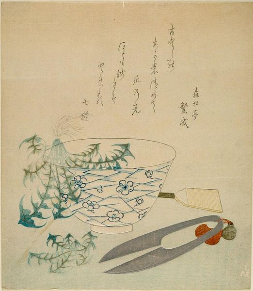 Curator: Let's explore this intriguing print by Katsushika Hokusai, titled "Saddle, Wringer, Smoking Outfit and Plum Branch/ The Cotton Spinning Horse (Watakuri uma)," part of his "A Selection of Horses" series. Editor: It’s quite charming! There's a domestic tranquility to it. I am drawn to the everyday objects rendered with such care. Curator: Indeed! Hokusai's focus on the tools of daily life elevates them. The saddle, for instance, isn’t just a saddle; it becomes a symbol of labor and travel. Consider the plum branch—a traditional signifier of spring and renewal. Editor: And the cotton spinning apparatus highlights the materiality of textiles, the labor involved in creating fabric. You see the materials, the woven basket, the cloth itself. It points to production. Curator: Absolutely. The objects collectively create a cultural narrative. Editor: The artist reminds us of the connection between human work and natural cycles. A beautiful meditation.