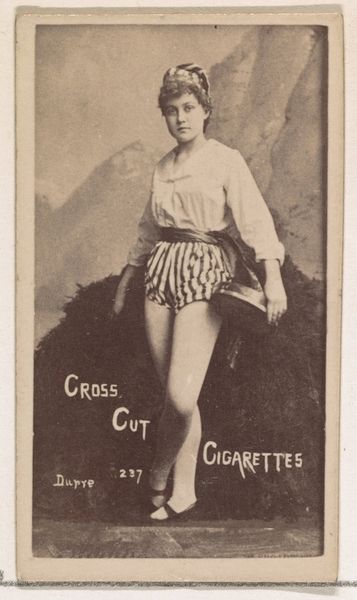 Editor: This is Card Number 191, Miss Leo, dating back to the 1880s. It’s part of the Actors and Actresses series by W. Duke, Sons & Co., who were promoting Cross Cut Cigarettes. The card is currently held at the Metropolitan Museum of Art. There's a quirky feel to this portrait, almost like a glimpse into a theatrical dream. What jumps out at you when you look at it? Curator: Oh, she's got that unapologetic sparkle, hasn't she? It feels like a playful wink across the decades! This isn't just a portrait, it's a tiny window into the booming world of advertising and celebrity culture finding its feet. Notice how the stairs she's lounging on become the actual advertising space? Sneaky and rather brilliant! Editor: That's a good point! It's more than just the product; it's crafting a whole persona. But why Miss Leo? Was she particularly famous? Curator: Exactly! She's selling a mood as much as cigarettes, an aspiration maybe. Whether Miss Leo was a household name, I couldn’t rightly say. Often, these cards hinted at fame more than representing genuine stardom. Did they succeed do you reckon? Did a packet of smokes equate to glamour? Editor: It's amazing to consider this as early influencer marketing. Something I’ll think about as I light up, ah, research *cough*. So it’s really about using people to sell products? Curator: Exactly that. Almost feels strangely contemporary, doesn’t it? From theatre stages to cigarette packs, celebrity and commerce began this intricate dance, it hasn’t stopped yet, either! The way our consumerist society gets constructed… it’s truly astonishing!