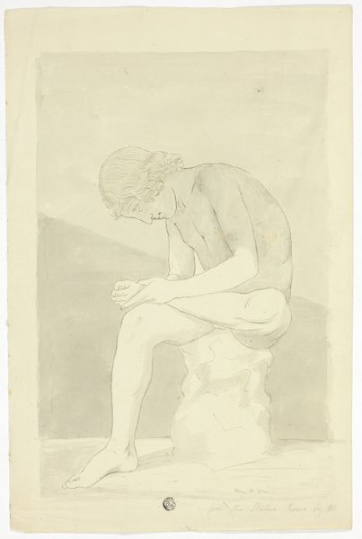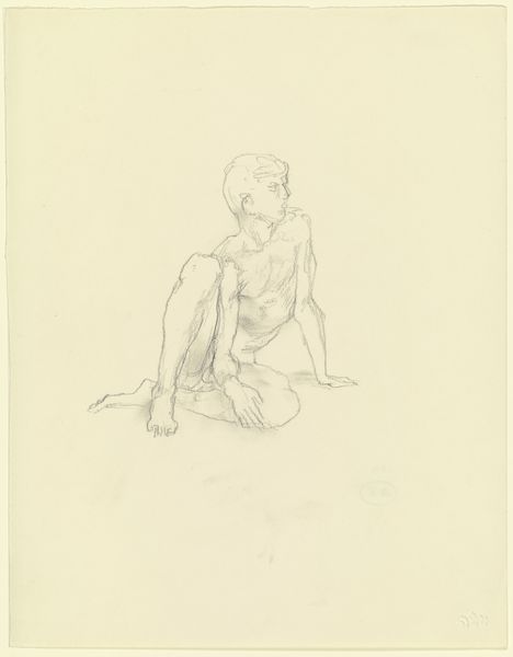Editor: This is "Female Nude, Kneeling, from Behind, Arms Behind the Back" by Georg Kolbe, a pencil drawing on paper. The figure is rendered in such a way that it seems caught in a private moment. It evokes a sense of introspection. What stands out to you in this drawing? Curator: The pose, immediately, speaks volumes. The clasped hands behind the back – it’s a restraint, perhaps even vulnerability. But consider how throughout art history, the female nude has often been loaded with symbolic weight. Editor: Loaded, how? Curator: Think about the concept of the gaze – who is looking, and why? In older works, nudes might be meant to titillate. Here, I see more of an internal landscape, a study of form reflecting emotional or psychological experience. Are you drawn to this particular expression of form, and what that could be symbolic of? Editor: It feels less about outward appearance and more about inner contemplation, but her pose feels slightly unnatural and uncomfortable. Curator: Precisely! The image offers multiple ways of seeing: classic academic form with something more modern – an almost awkward tension that pushes against the tradition of the nude. Consider also what this figure has inherited. How does she resemble—or diverge from—historical and classical depictions? Editor: That’s a great point. It’s made me reconsider the symbolism of the nude within a broader historical conversation. Thank you! Curator: Likewise! It's a compelling image to return to, especially in terms of re-examining symbols.