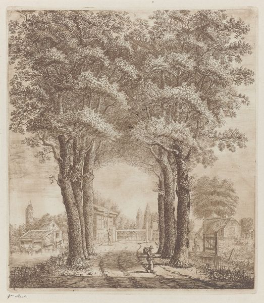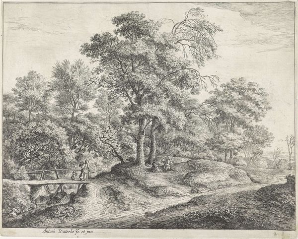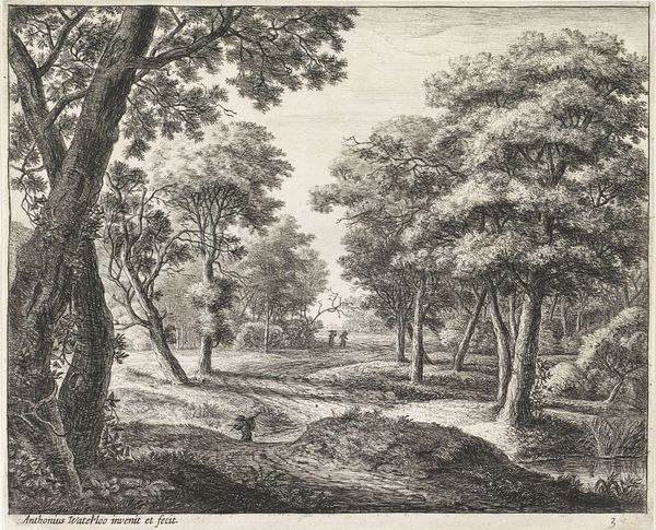 Adriaen Verboom's drawing presents us with a ‘driesprong’ or a three-way path, an image wrought with cultural significance. The crossroads, rendered here in delicate strokes, is more than a mere intersection; it's a symbol deeply embedded in our collective psyche. Throughout history, the crossroads has been a potent symbol of choice and destiny. Think of Hecate, the Greek goddess who presides over these liminal spaces. The crossroads is where decisions are made, where the future is uncertain, and where the past lingers. Observe how Verboom captures this tension; the path ahead is shrouded in shadow, the figures small and seemingly insignificant against the grandeur of the forest. This evokes a sense of vulnerability, a recognition of our limited agency in the face of larger forces. In earlier times, such places were often seen as points of spiritual intensity, places for offerings or rituals. Verboom's image subtly taps into this deeper resonance, reminding us that even in the most ordinary landscapes, echoes of ancient beliefs persist. The crossroads is not just a place; it's a psychological space where we confront our fears, our hopes, and our destinies.