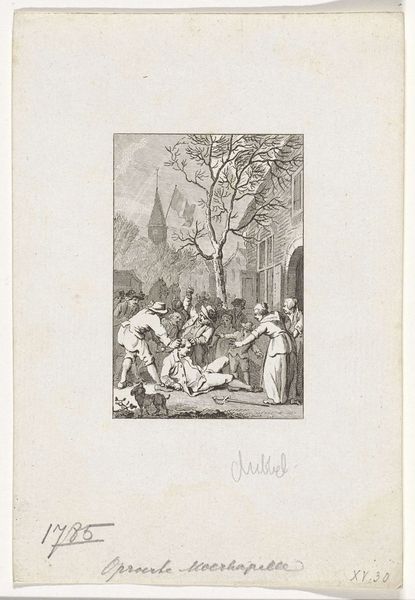 Reinier Vinkeles created this etching in 1785, titled 'Onrust onder Oranjegezinden in Den Haag', which translates to 'Unrest Among Orange Supporters in The Hague.' The print captures a moment of political turmoil in the Netherlands, reflecting the deep divisions between the Orangists, who supported the House of Orange, and the Patriots, who sought democratic reforms. Vinkeles, working during a period of intense political debate, depicts a street brawl, a literal manifestation of ideological conflict. The image is charged with tension and violence, as figures clash with swords and clubs. The setting in The Hague, the political center of the Netherlands, underscores the significance of these events. It serves as a historical record, but also invites us to reflect on the emotional and personal dimensions of political strife. How are individuals caught up in larger conflicts, and what are the human costs of ideological division? The work encapsulates a pivotal moment in Dutch history, reflecting the complex interplay of identity, loyalty, and political power.