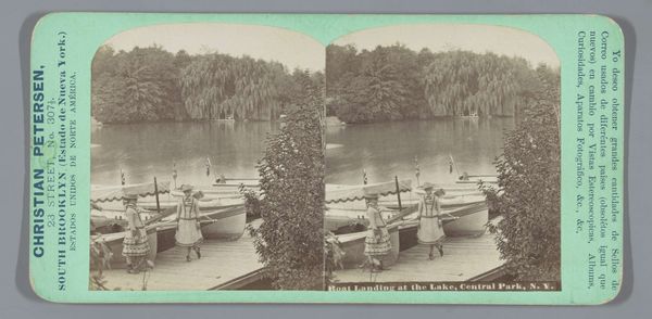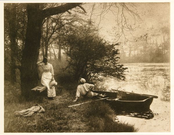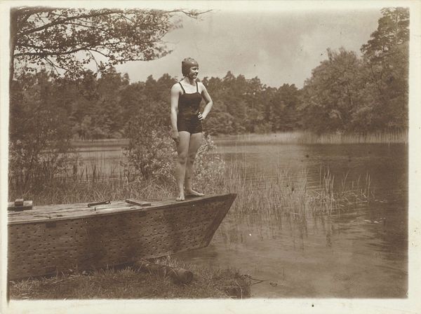 Curator: The piece before us, dated 1913, captures a moment of tranquil leisure. The Rijksmuseum holds this photograph by Geldolph Adriaan Kessler, titled "Portret van Johannes Cornelis Heijning en Margaretha Eugenia Fransen van de Putte in een kano," meaning "Portrait of Johannes Cornelis Heijning and Margaretha Eugenia Fransen van de Putte in a canoe." Editor: It’s lovely—like a page torn from a novel. Melancholy, almost. They seem so proper, so contained, even amidst what should be carefree fun. There is the visual stillness, like holding breath and the lake in front of them reminds me about Virginia Woolf. Curator: That sense of stillness certainly permeates the photograph. Considering the context of the early 20th century, we can understand that formal portraiture, even in informal settings, remained the norm. Their clothing and postures were all performative to class and cultural rituals. Note the white dress on Ms. Fransen van de Putte, with some kind of drapery going all around, also note the little hat on top of her head, quite fashionabble back then, as much as Mr. Heijning's tailored suit with matching tie. The flag could point to the family's social status, too, of course. Editor: Flags always speak volumes, don't they? It’s interesting how the flag, while seemingly indicating a place, a belonging, can also signal exclusion—a demarcation of “us” versus “them.” And you know, it adds a strangely competitive edge to the scene, like, "we are winning the race", that contrasts deeply to the serene image. I'm finding myself imagining their conversation to be utterly forced. Curator: Forced or not, these types of portraits also served to preserve memories. What could a boat symbolise here? What psychological projections where triggered when people sailed in water? The couple canoeing is an old topos in arts. Editor: Right! It might signal the waters of the unconscious, or a journey into unknown parts of themselves. It invites exploration of the deeper meanings, to me, about how they relate each other, in still waters as on wild rivers. I do feel their psychological drama. Curator: A valid point. The landscape itself offers contrasting readings. The smooth lake contrasts the bushy thicket. Do they point to unknown challenges? Does the landscape participate as a subliminal communication? Editor: I'd like to think that both knew very well the undercurrents beneath a superficially harmonious partnership, as it seems! Curator: Well, in either case, the image functions as a beautiful study of a very complex world. Editor: True. A silent poem indeed.