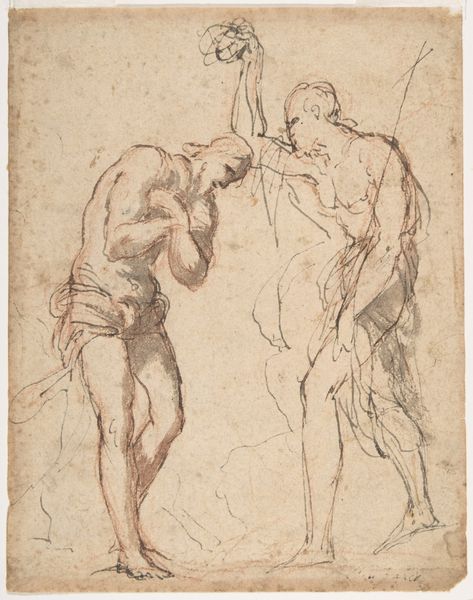 Editor: Right, next up we have 'Two men, carrying an old woman,' a pencil drawing by Melchior Lorck, created around 1550. It's a whirlwind of figures. Very dynamic, slightly grotesque even, but undeniably skilled. I'm curious, what’s your take on this? Curator: Grotesque is a fascinating word choice. It feels viscerally potent, doesn’t it? This drawing, it feels like stepping into a fever dream of the Renaissance. There’s this incredible tension between the idealized classical form, those muscles, that heroic physique and the unsettling subject matter: burdened, strained bodies and that frantic urgency! What's your sense of the space? Is it a specific place, or something more symbolic? Editor: I don’t get any sense of place at all, to be honest. They are kind of floating. Makes me think they’re trapped in a kind of eternal, physical struggle, you know? Maybe something from mythology. Curator: Precisely! This is where it starts resonating beyond mere observation of anatomy. The lack of background is so telling. Lorck isn't grounding them in reality. The piece invites you to think about the weight we carry, physically and emotionally. A story of strength and of strain, where perhaps everyone involved is carrying something burdensome. But maybe that's me projecting? Editor: No, I totally get that. It makes it less of just a study of the body and more of a study of human condition, doesn’t it? Something far more lasting! Curator: Indeed. It makes me wonder what burdens, visible or invisible, we're all destined to carry. A melancholic reflection on the human spirit. Editor: That definitely gave me a whole new perspective! I had seen dynamic composition but glossed over its deeper meaning. Curator: It makes us appreciate how just a simple drawing can speak volumes, right?