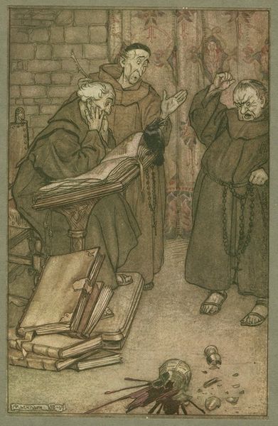 Curator: This watercolor from 1902 is titled "Abuelo with Esbjörn," crafted by Carl Larsson. It depicts an elderly man perched on a table, observed by a small child dressed in red. Editor: It possesses a delightfully quirky feel! The color palette, predominantly muted greens and reds, fosters an almost dreamlike atmosphere. And that precarious positioning of the elder feels both humorous and slightly unsettling. Curator: Absolutely. Larsson’s application of watercolor grants a lightness to the work, even though the subject matter—an old man and potentially, his grandchild, perhaps conjures associations of gravity. Consider also how Larsson incorporates varied illustration styles within a single plane. Editor: Can you unpack that for me? Curator: Notice the cartoonish character engaging with the elder and, in stark contrast, the faintly drawn and more realistic classical sketches along the back wall: it is semiotic excess at play within this single piece. Larsson masterfully blurs boundaries to toy with the audience. Editor: That tension, between the vibrant, almost fairytale-like figure of the child and those stark, almost ghostly historical sketches on the back wall is definitely doing something here! What do we know of how Larsson thought about generational divides? Curator: It is certainly an area open to rich interpretation! He renders his figures carefully, the Abuelo appearing self-possessed and, in juxtaposition, that lively energy projected by Esbjörn! There is also a performative, gendered power dynamic at play as he is on display. Editor: Looking at this composition, with its multiple visual registers, I wonder how intentional this kind of deconstruction truly was? Curator: Whether completely calculated or more intuitive, the layering of stylistic approaches adds substantial depth. The contrast is so compelling, encouraging prolonged and repeated viewings! Editor: Precisely! It is through these formal tensions and painterly techniques that Larsson transforms what initially reads as a genre-painting, into something genuinely peculiar. It invites viewers to consider not only their own position but broader historical narratives around selfhood and presentation, and representation, for the sitter!