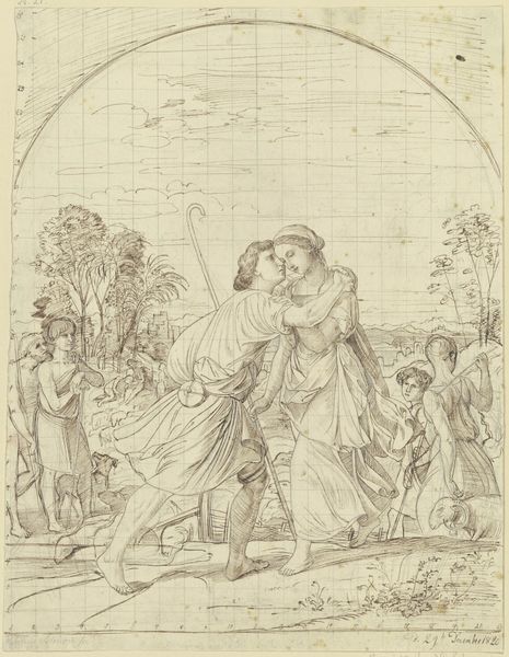 Curator: This delicate drawing is entitled "Jacob and Rachel" by Julius Schnorr von Carolsfeld, created around 1820 or 1821. It resides here in the Städel Museum. The piece is crafted with pencil on paper. Editor: It's incredibly subtle. There's a dreamlike quality to it, almost ethereal. The muted tones of the pencil render such intimacy and tenderness. I almost feel like an intruder just observing. Curator: Absolutely. Schnorr von Carolsfeld was a key figure in the Nazarene movement, which sought to revive spiritual values in art. They very consciously modeled themselves after the masters of the early Renaissance, especially when confronting secularisation, such as exploring the intersections between sacred and domestic life. Editor: That’s clearly reflected here, not only in its subject which references biblical figures and stories, but also how their figures almost disappear back into nature through line work and lack of chiaroscuro modeling, but also in a rejection of academic painting standards which are also challenged here. The tenderness represented becomes a model for ethical relationships. What is represented and how, becomes part of a social program to revitalize an ethico-religious world view. Curator: That is interesting; there's an intentional archaism at play. He clearly looked to the past for visual language and inspiration; his integration of the natural landscape around the romantic protagonists suggests his interest in establishing the biblical figures as part of history, situating religious art in a secularized public. The composition itself seems deliberately simple and classic. Editor: Which can also read as restrictive. Who gets to partake in the ethical life? Is that not a conversation about accessibility and power dynamics still very present in artistic practice? It is worth thinking critically not just of the style and intention, but what such forms allow and constrain when it comes to artistic interpretation and engagement. Curator: I see your point; by grounding the spiritual in a deliberately idealized past, there’s a certain sense of exclusion happening as well. Still, I find its tenderness compelling, something to think about. Editor: Absolutely, a worthwhile encounter which encourages critical discussion, that is invaluable!
